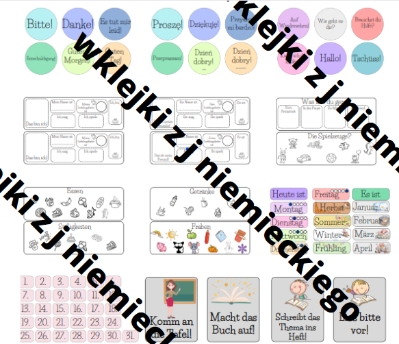 Ucz od pierwszych lekcji podstawowych zwrotów w języku niemieckim. Zestaw zawiera "magiczne słowa" w języku niemieckim z ich polskimi odpowiednikami (można wykorzystać do gry w Memo, Ja mam - kto ma lub do dzielenia uczniów w klasie w pary), polecenia nauczyciela oraz gotowe do wydrukowania materiały do stworzenia w klasie kalendarza - uczniowie uczą się nazw pór roku, miesięcy, określają datę oraz pogodę. Materiał można także wykorzystać do wykonania Lapbooka tematycznego - Rok (pory roku, miesiące, pogoda) Dodatkowe zadania to np. Karta pracy: Das bin ich / Das ist mein Freund/meine Freundin. Wklejki do zeszytu lub do wykorzystania do zrobienia gazetki, pomagające przypomnieć i utrwalić słownictwo z klasy 1: Was isst du gern? Die Spielzeuge. Was machst du in der Schule? Essen. Farben., itp.