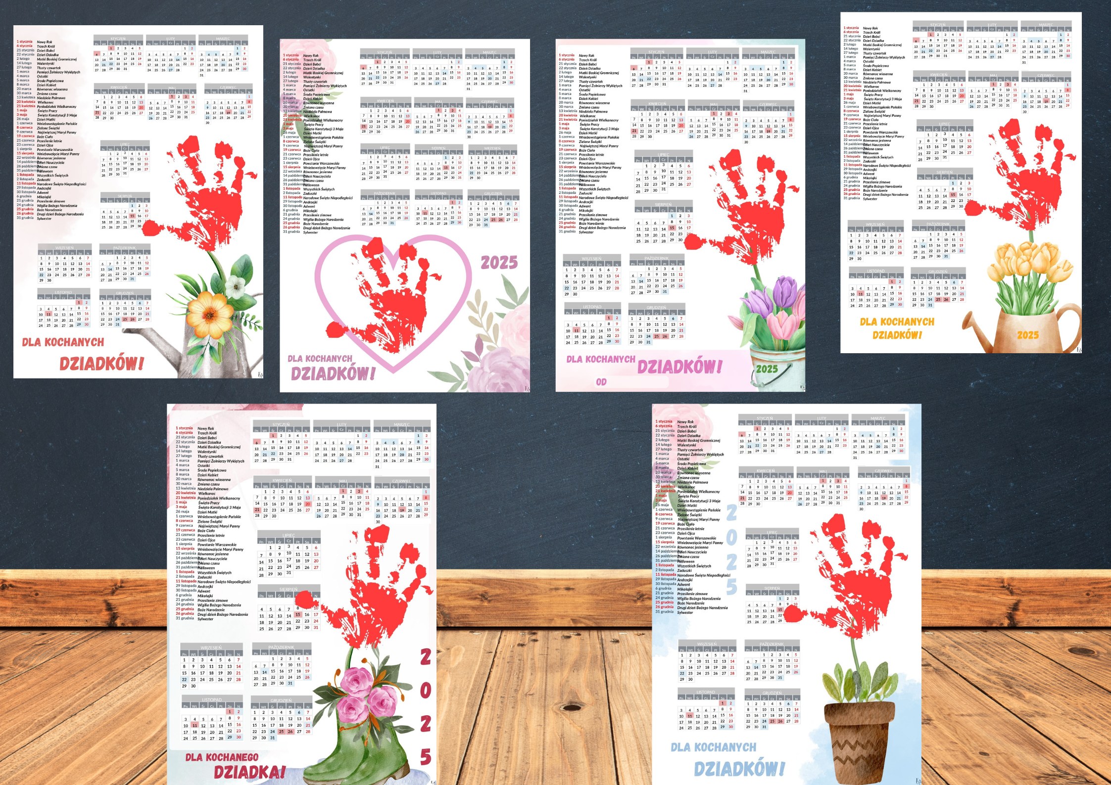 Zestaw "Kalendarze 2024" zawiera plik wyjątkowych kalendarzy z możliwością odbicia dłoni. W tym kalendarze również w wersji do pomalowania. Kalendarze w wersji :
