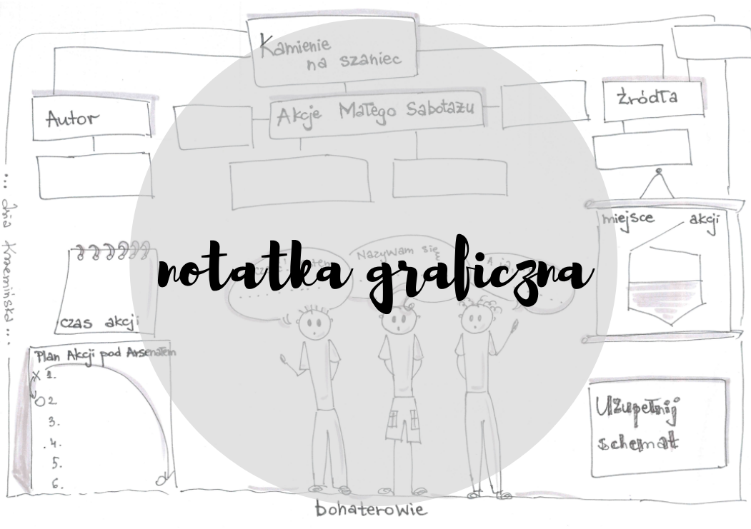 Notatka graficzna porządkująca najważniejsze informacje o lekturze. Sprawdzi się doskonale jako materiał, dzięki któremu zorientujemy się , na ile uczniowie przeczytali lekturę. Notatkę można też zaproponować młodym ludziom w ramach podsumowania pracy z tekstem lub jako powtórkę przed egzaminem.