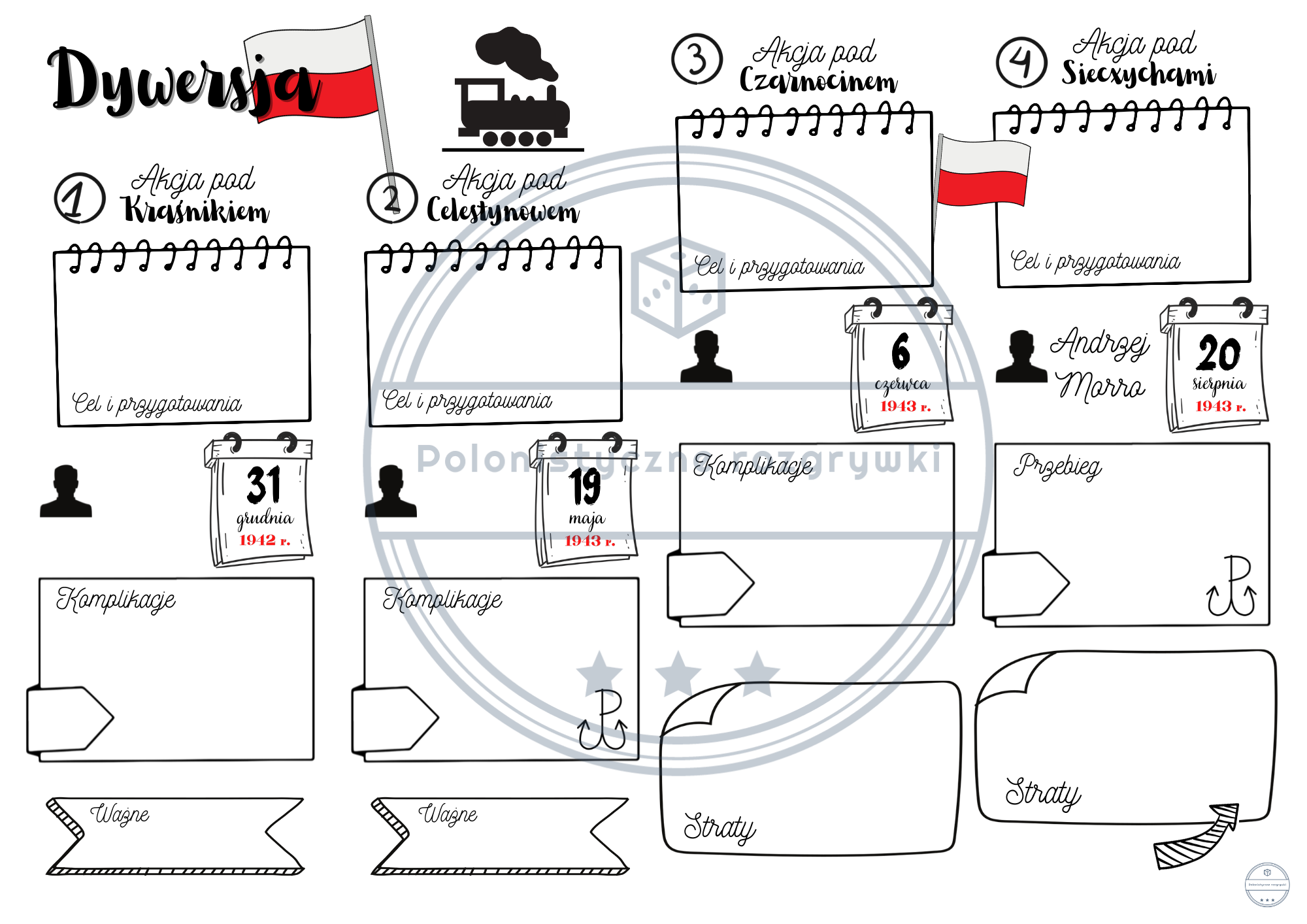 Plik zawiera 2 karty pracy umożliwiające dokładne omówienie tematu dywersji oraz powtórzenie i utrwalenie wiadomości o akcjach dywersyjnych w lekturze Kamienie na szaniec.