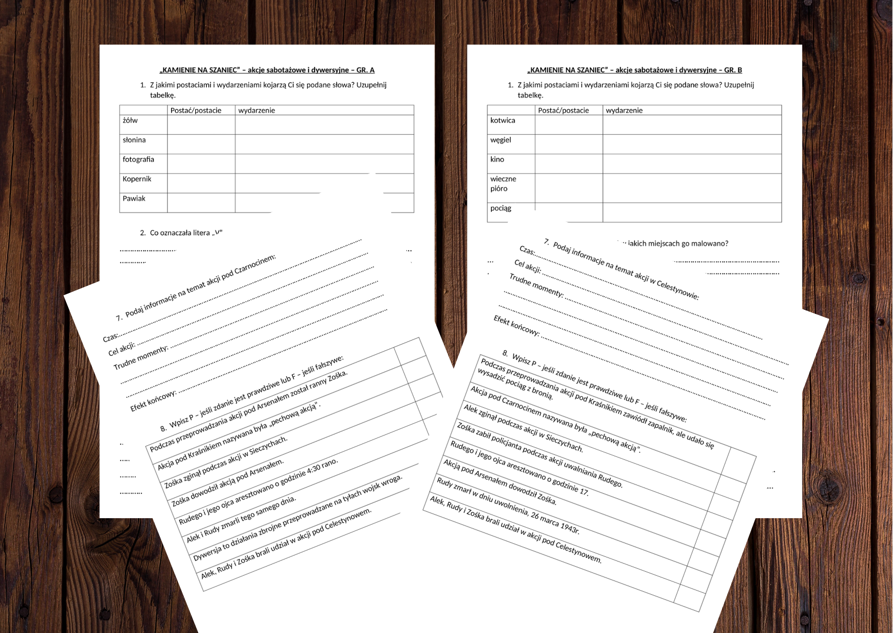 KAMIENIE NA SZANIEC. Kartkówka dla dwóch grup (8 zadań), dotycząca akcji Małego Sabotażu i akcji dywersyjnych, w których brali udział bohaterowie lektury. Materiał jest w formacie word, więc można go edytować i zmieniać.