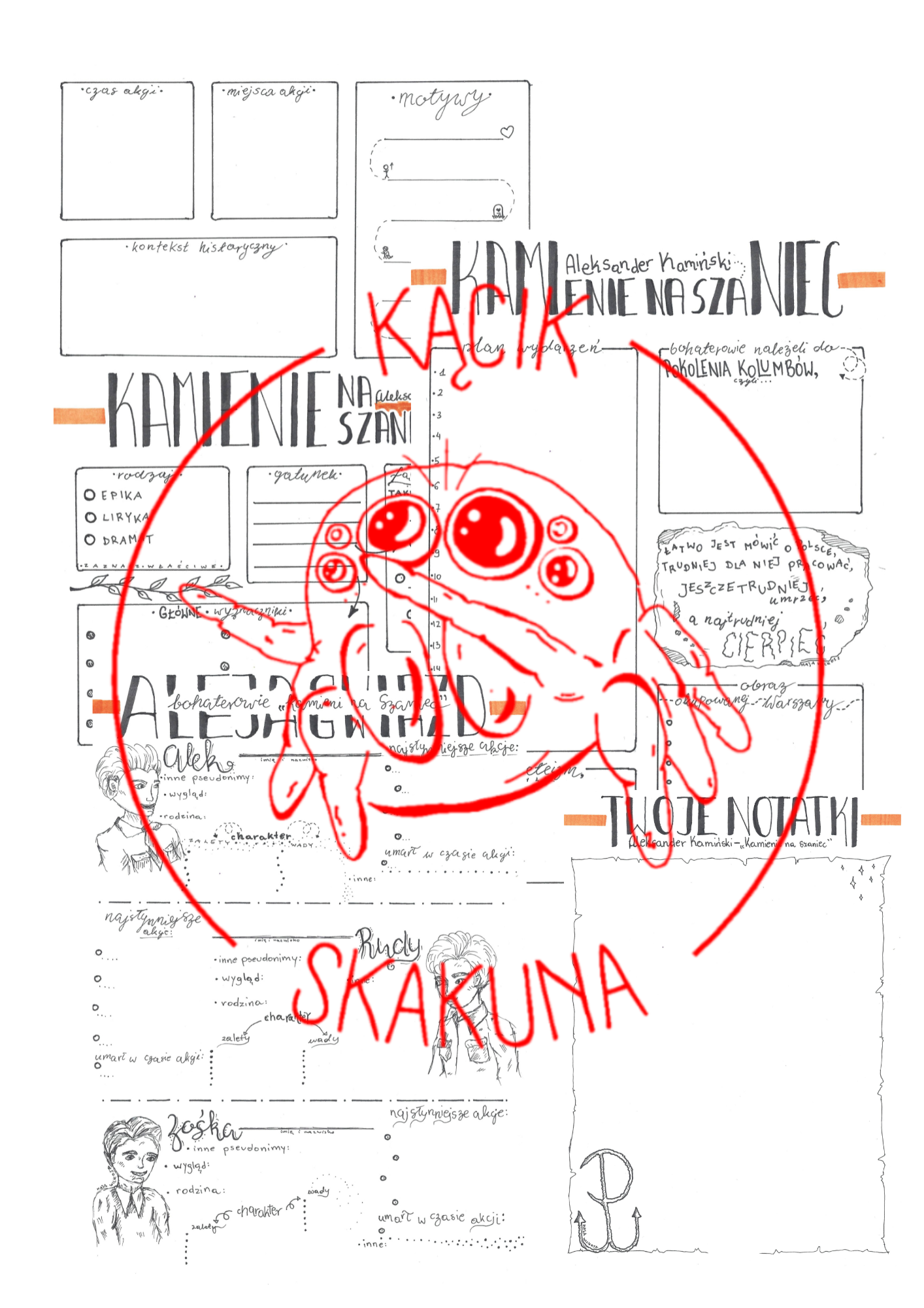 Zestaw 3 rysnotek pomocnych w omówieniu lektury obowiązkowej "Kamienie na szaniec" Aleksandra Kamińskiego. Tematyczna strona na notatki stanowi gratisowy dodatek do pakietu.