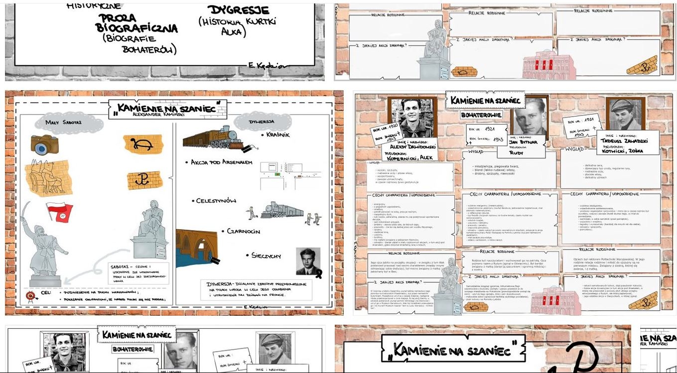 Materiał obejmuje karty pracy z charakterystyką głównych bohaterów z utworu "Kamienie na szaniec"; omówienie działań dywersji i Małego Sabotażu; Dodatkowo wklejka z omówieniem gatunku literackiego.