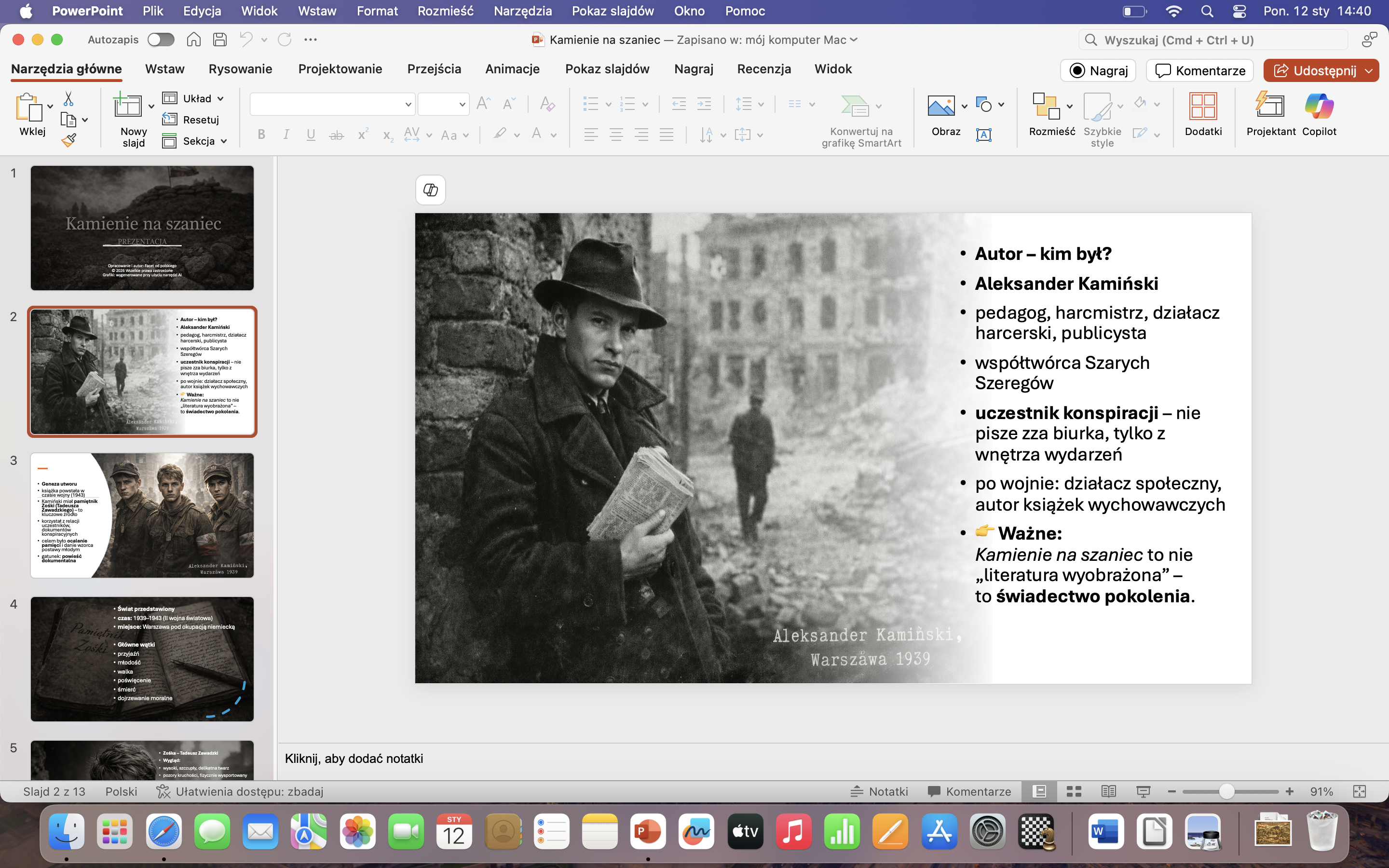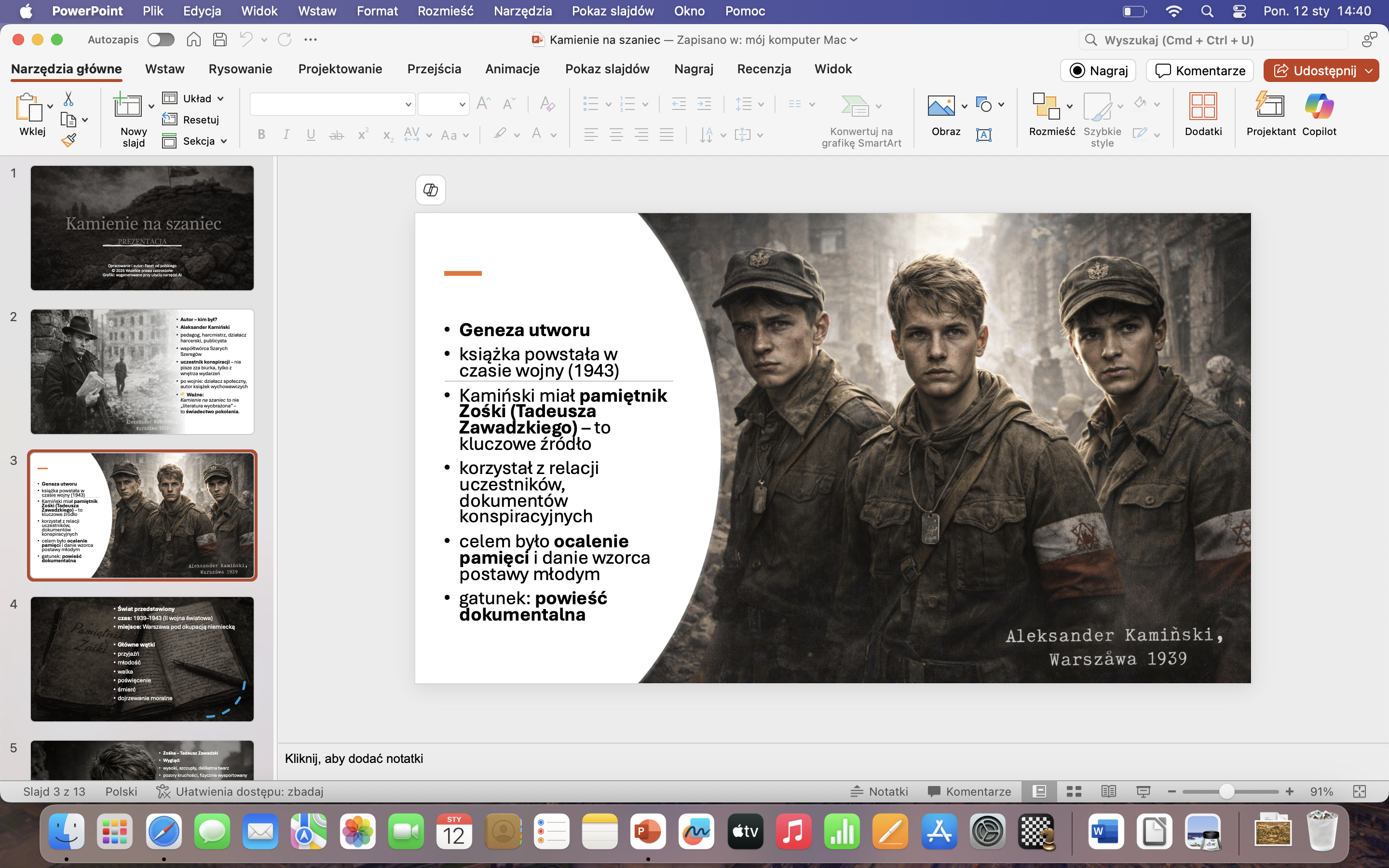 Co zawiera prezentacja? ✔ autor i kontekst historyczny (książka jako świadectwo wojny, nie fikcja) ✔ geneza utworu – pamiętnik Zośki, relacje konspiracyjne ✔ czas, miejsce i świat przedstawiony ✔ szczegółowa charakterystyka bohaterów: Zośka, Alek, Rudy ✔ mały sabotaż i dywersja – jasno wyjaśnione różnice ✔ akcja pod Arsenałem – przebieg i znaczenie ✔ motyw przyjaźni, ofiary i dojrzewania w czasie wojny ✔ Pokolenie Kolumbów + nawiązania do twórczości Baczyńskiego ✔ materiał uporządkowany pod egzamin ósmoklasisty