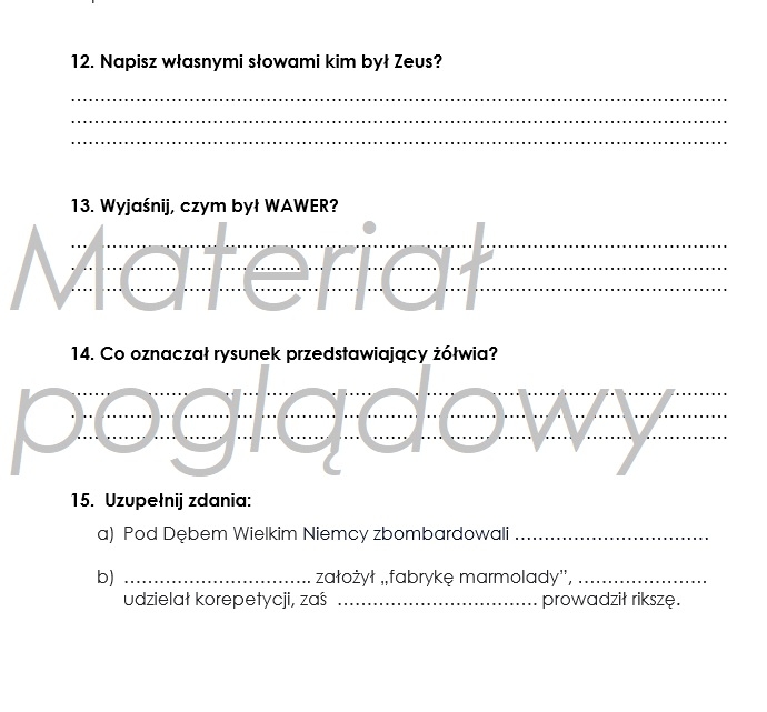 Test z lektury "Kamienie na szaniec". Zawiera 15 pytań. - odpowiedzi do wyboru "a-b-c" - tekst z lukami do uzupełnienia - pytania otwarte Brak odpowiedzi do testu