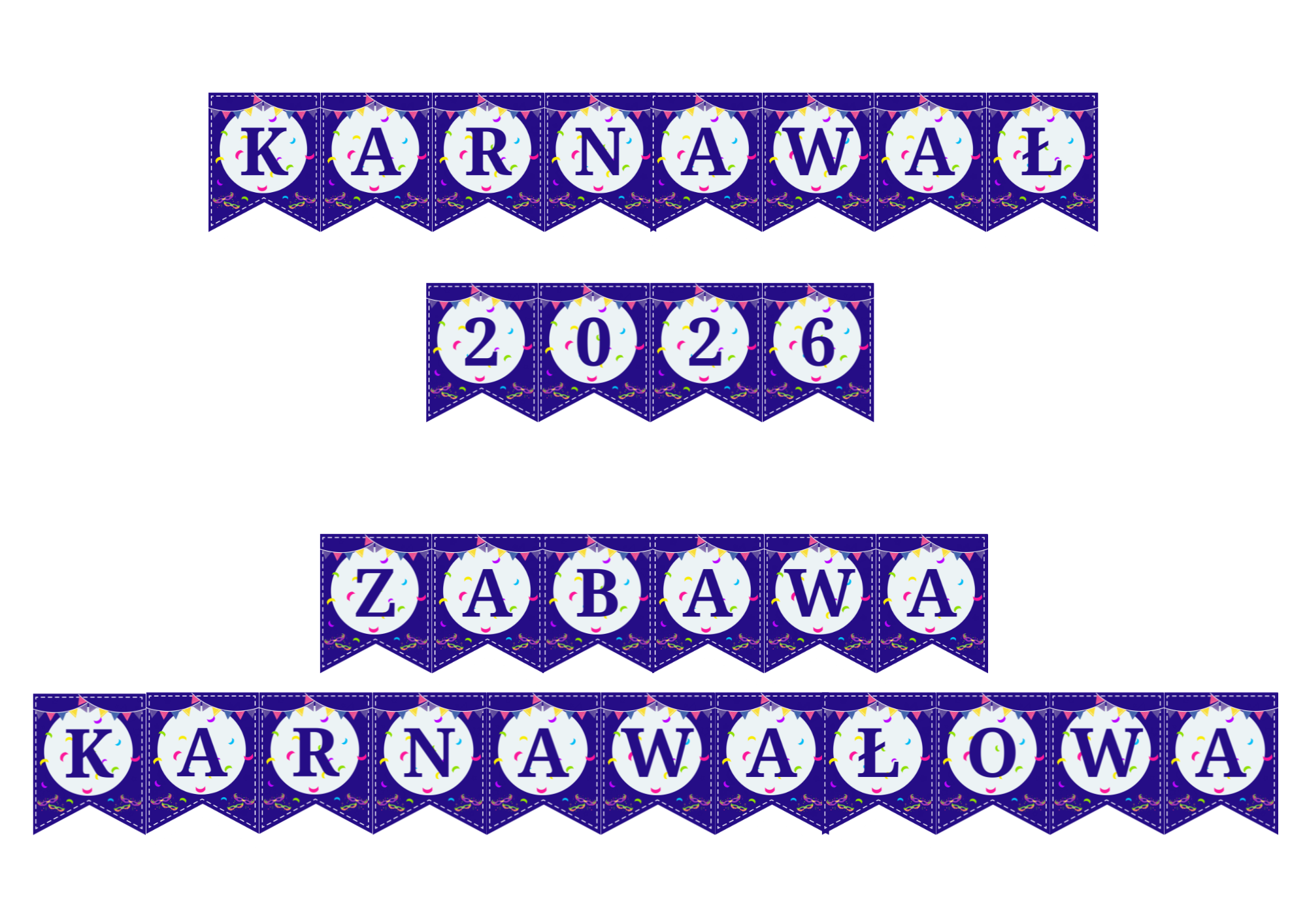 🎭 KARNAWAŁ 2026 – ZABAWA KARNAWAŁOWA 2 girlandy | PDF A4 Zestaw dwóch girland karnawałowych z napisami „KARNAWAŁ 2026” oraz „ZABAWA KARNAWAŁOWA” to prosta i efektowna dekoracja na bal karnawałowy w przedszkolu lub szkole. Doskonale sprawdzi się jako ozdoba sali, tablicy lub gazetki ściennej, wprowadzając radosny, karnawałowy klimat. Materiał przygotowany jest w formacie PDF A4 i przeznaczony do samodzielnego wydruku. Po zalaminowaniu girlandy mogą być wykorzystywane przez kolejne lata. Produkt cyfrowy dostępny do pobrania bezpośrednio po zakupie.