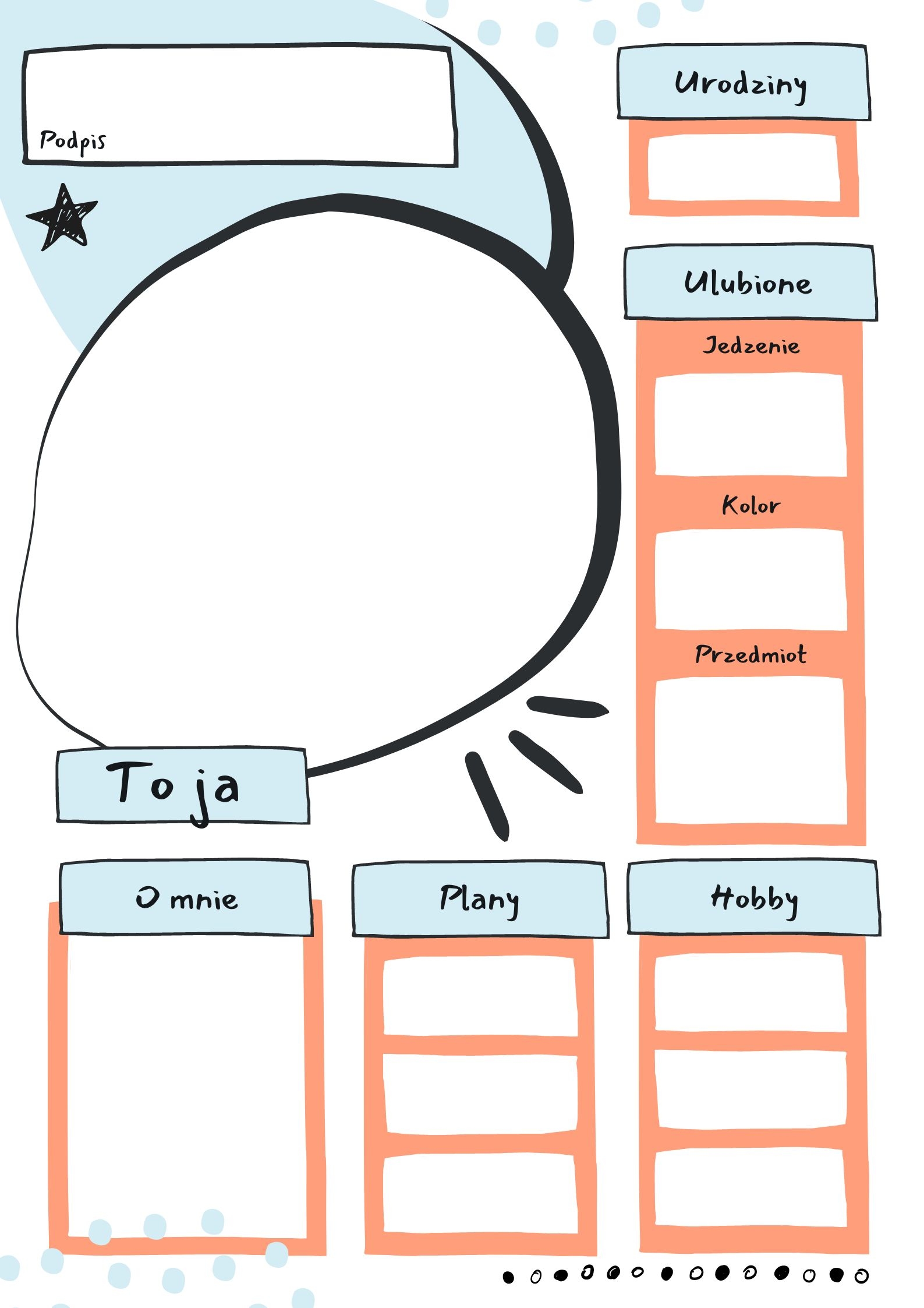 Karta dla ucznia, do wypełnienia opisami i rysowanym autoportretem. Świetna aby zdobyć informację o uczniu. Doskonale nadaję się jako strona do klasowej kroniki. Zachować i rozdać w 8 klasie :-)