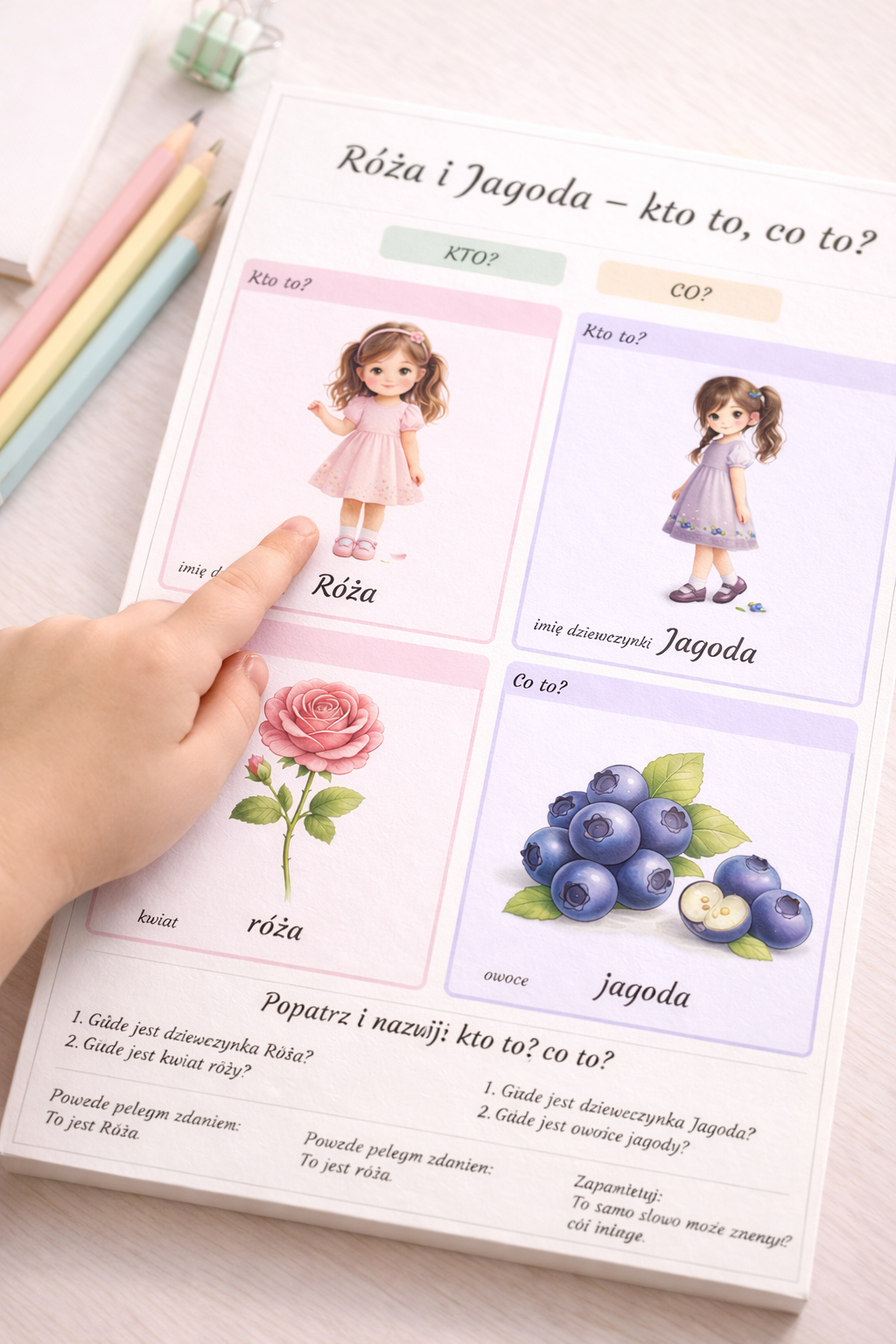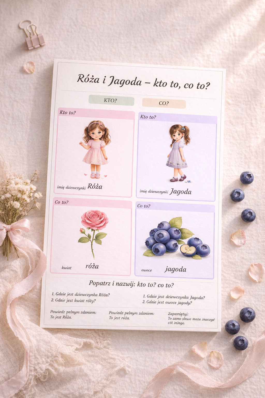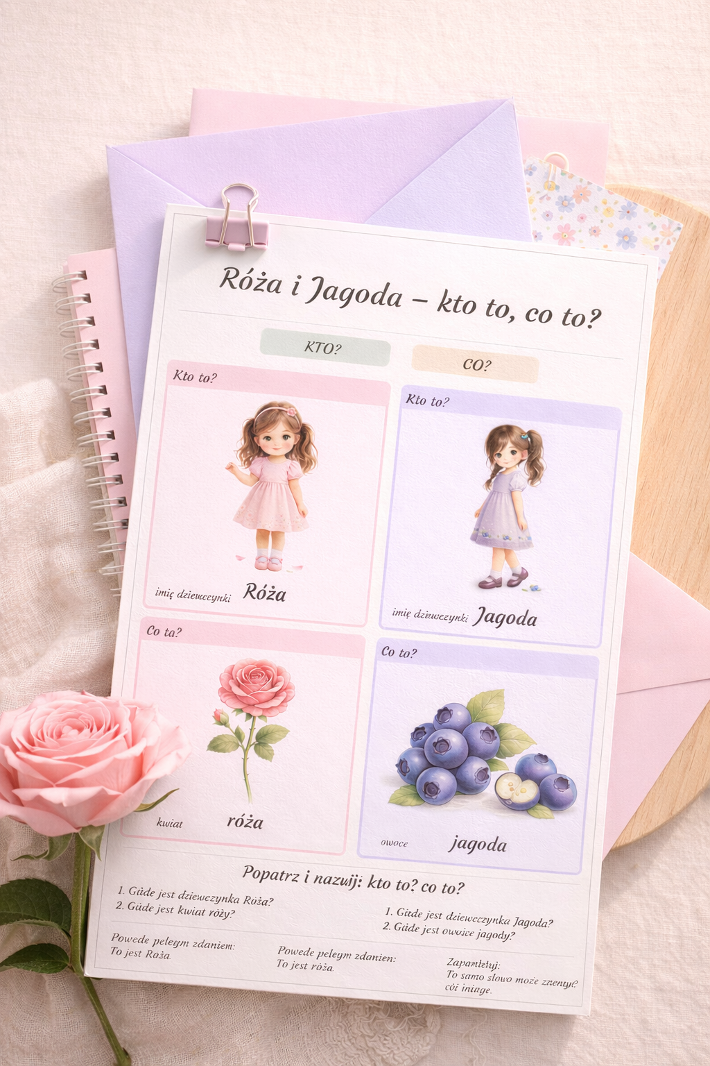 🌷🫐 „Róża i Jagoda – kto to, co to?” to pięknie przygotowana karta obrazkowa, która w atrakcyjny i bardzo przyjazny sposób pomaga dziecku zrozumieć różnicę między pytaniami „kto to?” i „co to?”. To doskonały materiał do nauki języka, rozwijania słownictwa oraz ćwiczenia uważnego patrzenia i poprawnego nazywania osób i rzeczy. ✨