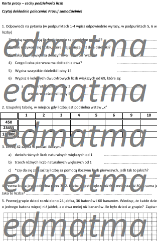 Karta pracy jest idealna na podsumowanie całego działu z cech podzielności liczb, ponieważ zawiera pytania teoretyczne, zadania praktyczne oraz dwa zadania z tekstem.