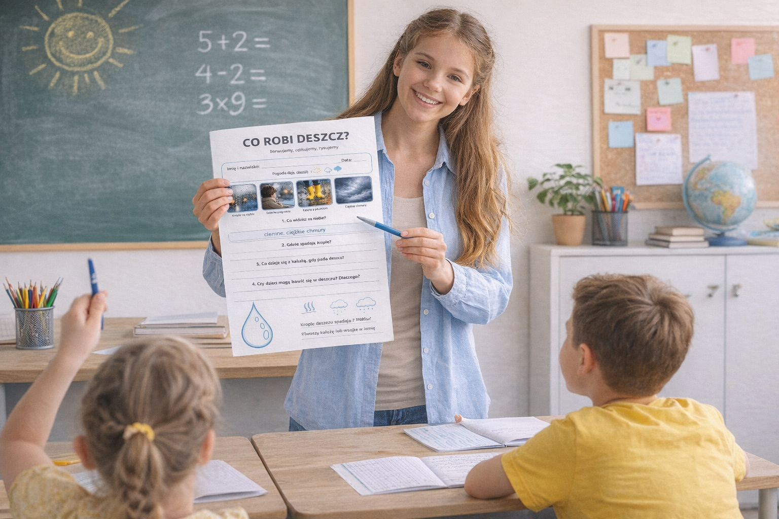 Odkryj magię deszczu z uczniami! 🌧️📚 Ta pięknie zaprojektowana, dwustronicowa karta pracy to gotowy, profesjonalny materiał do natychmiastowego użycia na lekcji — idealna dla klas 1–3. Przyjazna grafika, jasne instrukcje i aktywności angażują dzieci: obserwują, opisują, rysują i porównują. Doskonała do lekcji przyrody, tematu pogoda i ćwiczeń językowych.
