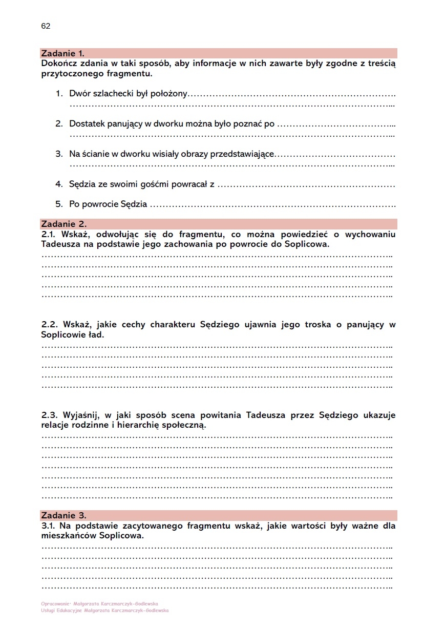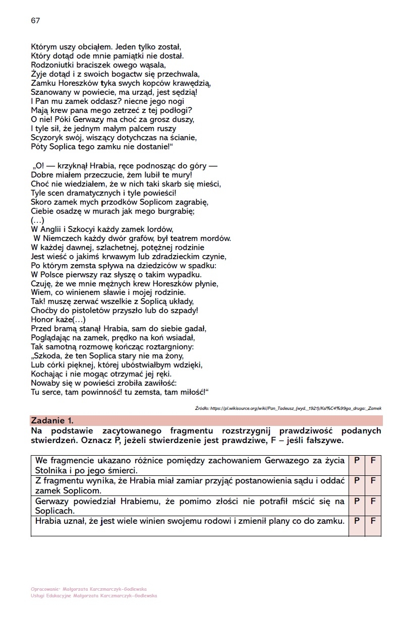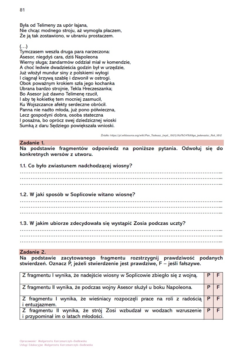 Zestaw do krytycznego (czytam i rozumiem) czytania lektury "Pan Tadeusz". W zestawie fragmenty z ksiąg: I, II, IV, X, XI, XII. Z każdej księgi fragmenty do czytania oraz pytania sprawdzające poziom rozumienia tekstu, analityczne oraz interpretacyjne.