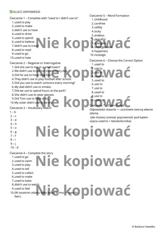 Ta karta pracy została stworzona z myślą o nauczycielach i lektorach, którzy chcą wprowadzić konstrukcję “used to” w sposób naturalny, emocjonalny i angażujący. Idealna dla uczniów na poziomie B1, łączy w sobie ciepłą, nostalgiczną czytankę z zestawem różnorodnych, rozwijających ćwiczeń.
