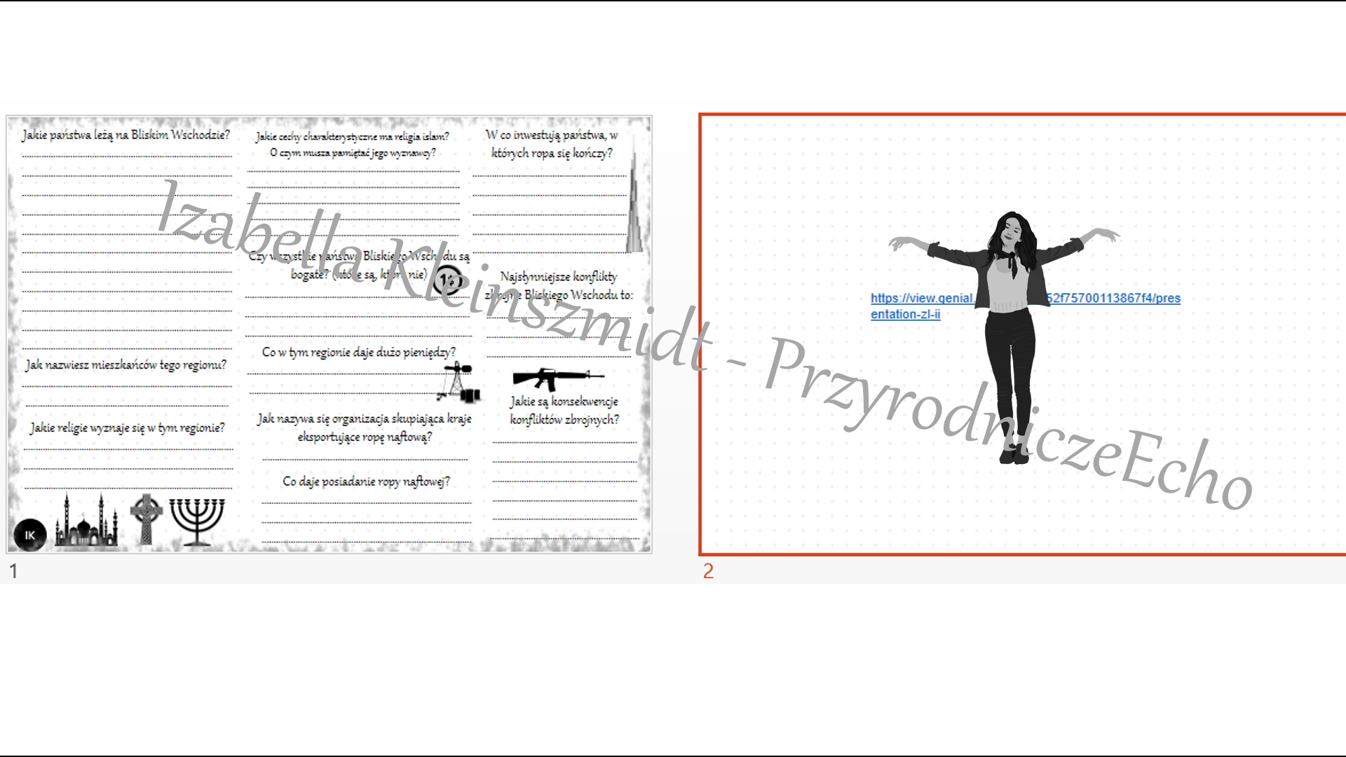 Zapraszam do zakupu karty pracy „Bliski Wschód - kultura i nauka” dostosowanej do podstawy programowej i do niekomercyjnej prezentacji – pomysłu na lekcję – wykonanej w genially w wersji edu pro. Tak wygląda gratis –
