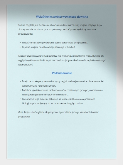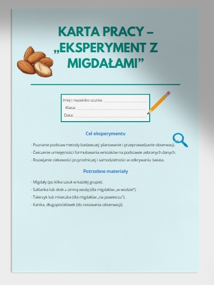 Karta pracy „Eksperyment z migdałami” to doskonałe narzędzie edukacyjne, które wspiera naukę metody badawczej poprzez praktyczne obserwacje. Jest skierowana do uczniów w celu rozwijania ich umiejętności analitycznych i ciekawości przyrodniczej.