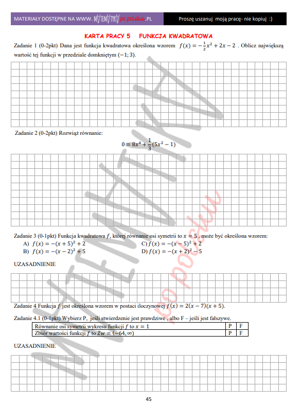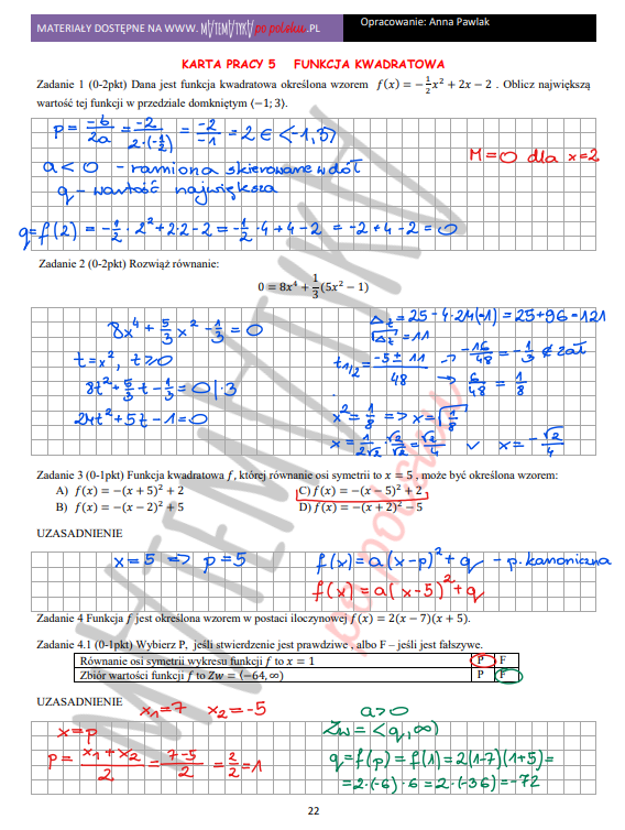 Karta pracy, którą państwu udostępniam, zawiera 12 stron i jest piątą z siedmiu zawartych w 1 części ebooka i dotyczy funkcji kwadratowej. Składa się ona z dwóch części: