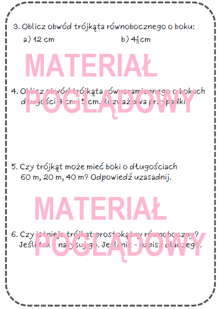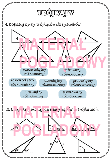 Karta pracy lub kartkówka w dwóch grupach i dwóch rozmiarach. Podsumowanie rodzajów trójkątów, miar kątów w trójkątach, nierówność trójkąta, obwody.