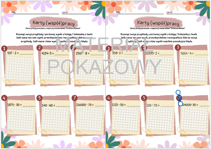 Karta pracy powstała z inspiracji pomysłem "Królowa matma" - karty współpracy. Przygotowałam wersję z mnożeniem pisemnym. Uczniowie w ławce otrzymują dwie różne karty pracy, ale wynik poszczególnych przykładów musi być taki sam. Jeśli nie jest, uczniowie muszą poszukać błędu.