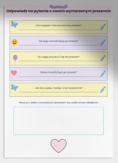 Uzupełnij pole z pytaniami i narysuj siebie z prezentem!