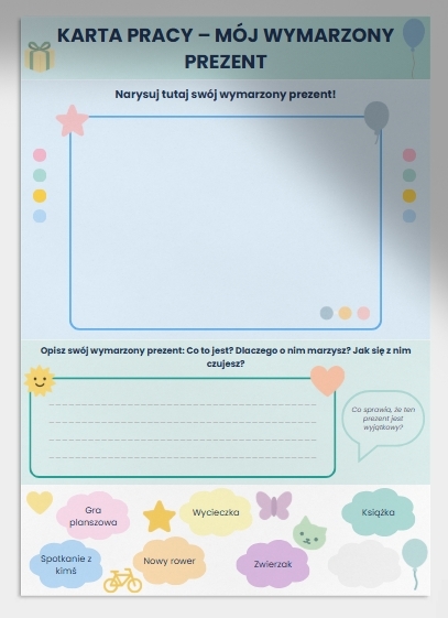W kilku zdaniach opisz swój wymarzony prezent – napisz, co to jest, dlaczego o nim marzysz i jak się z nim czujesz! ✍️💭