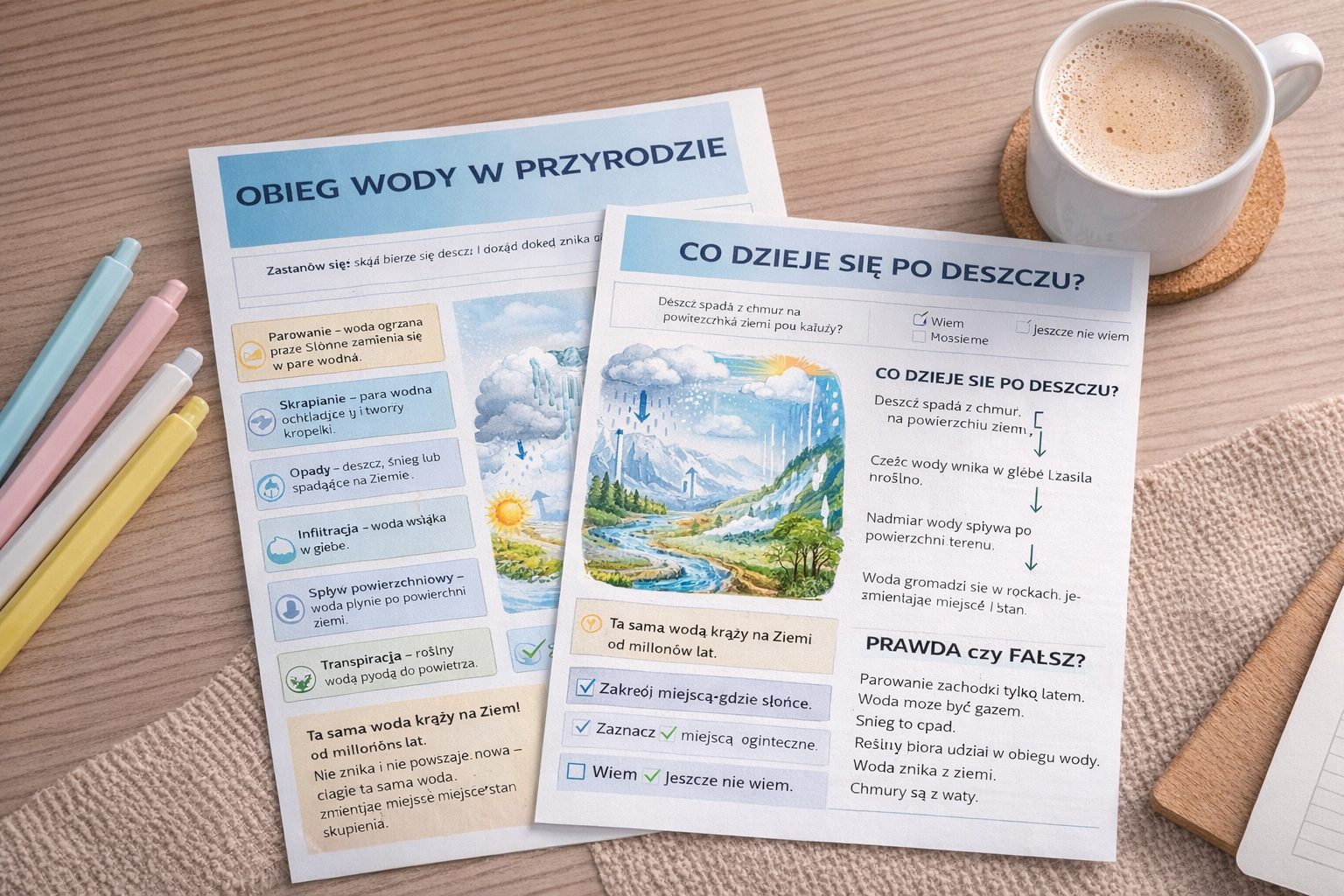 To dwustronicowa karta pracy w formacie PDF, poświęcona tematowi obiegu wody w przyrodzie, zaprojektowana od A do Z z myślą o realnej pracy na lekcji.