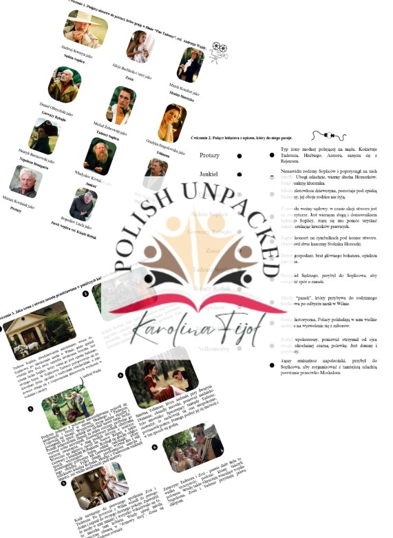 Karta pracy składa się z trzech zadań: pierwsze polega na dopasowaniu aktorów do bohatera, którego grają, drugie na dopasowaniu bohatera lektury do opisu, trzecie do opisania ukazanej w kadrze sceny. Zestaw zawiera zarówno puste karty pracy, jak i odpowiedzi.