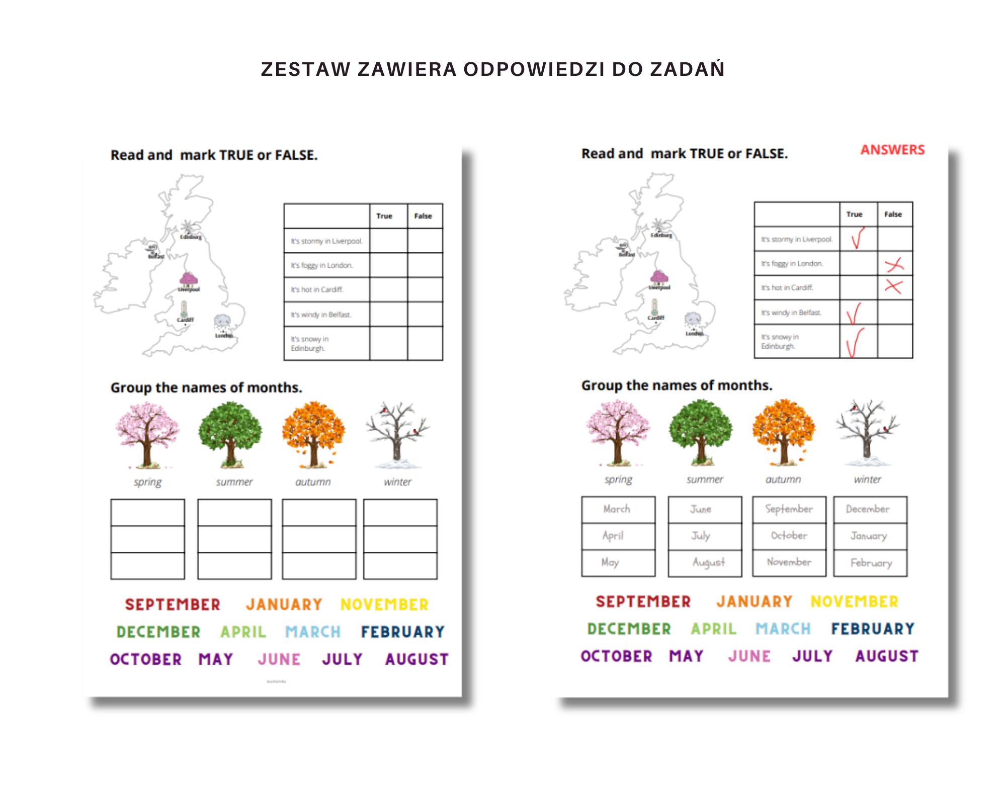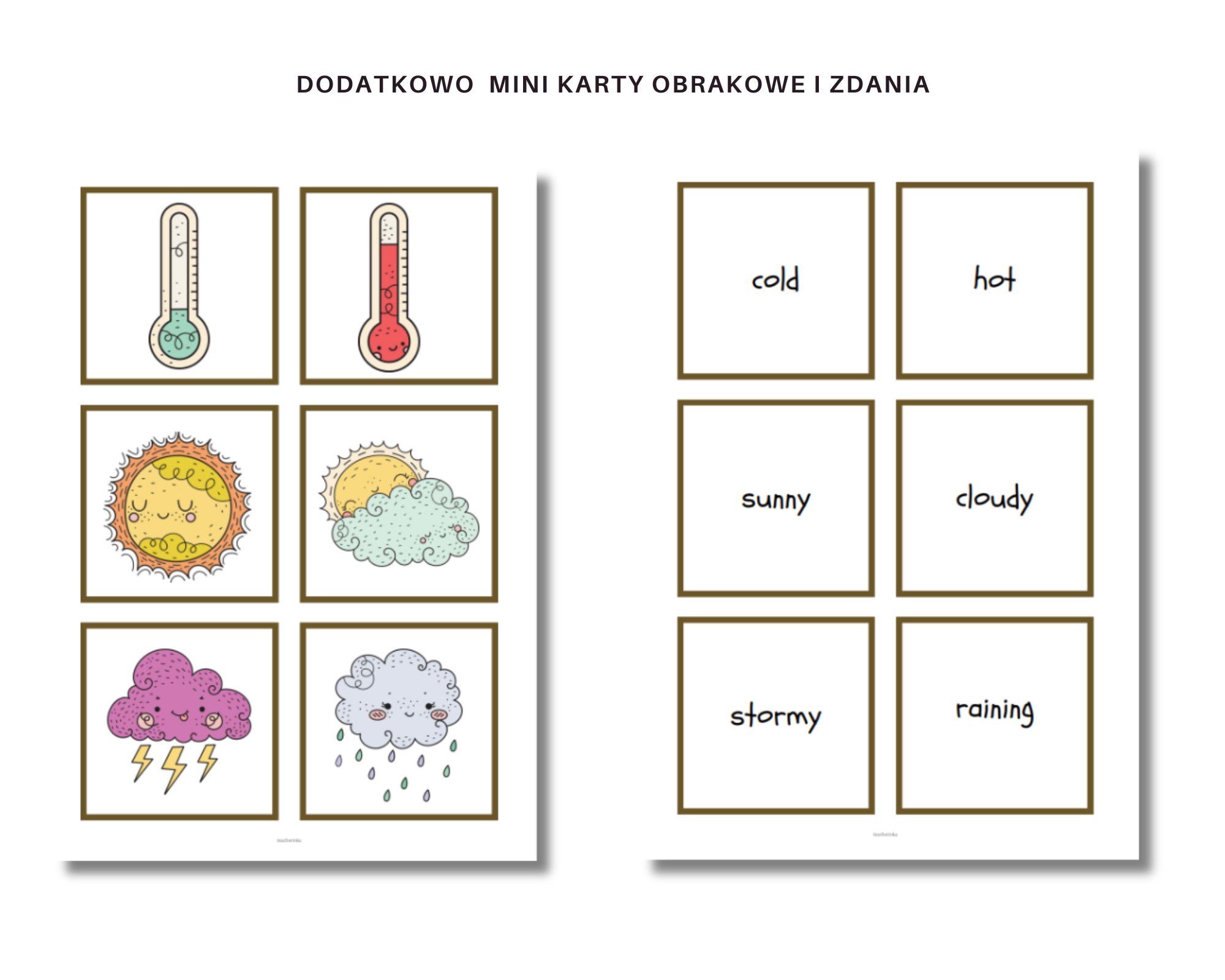 Co w zestawie: - Mini karty obrazkowe i wyrazowe z słownictwem związanym z pogodą: hot, cold, sunny, cloudy, stormy, raining, spring, summer, autumn, winter, rainbow, snowy  (Strony 1-4) - Ćwiczenia leksykalne na czytanie i pisanie słów i zdań związanych z pogodą. Dodatkowo pojawiąją się w nich nazwy dni tygodnia, pory roku i miesiące (Strony 5-8). - Odpowiedzi - do zadań są dołączone odpowiedzi do zadań (Strony 9-12) - Karta z podziękowaniami