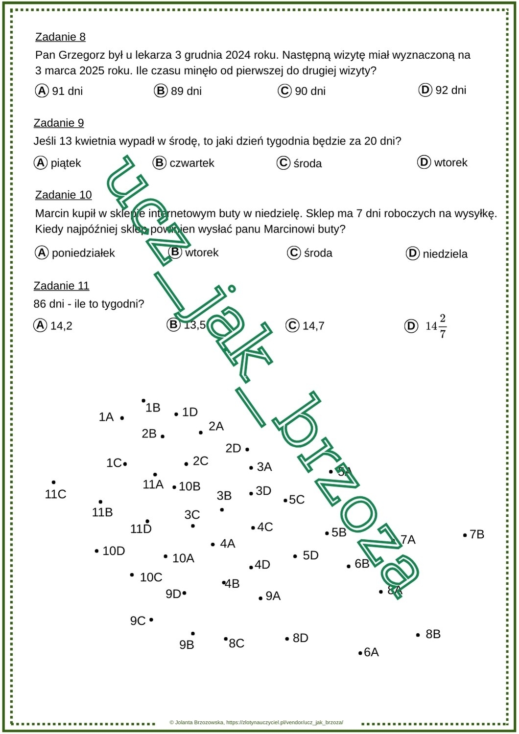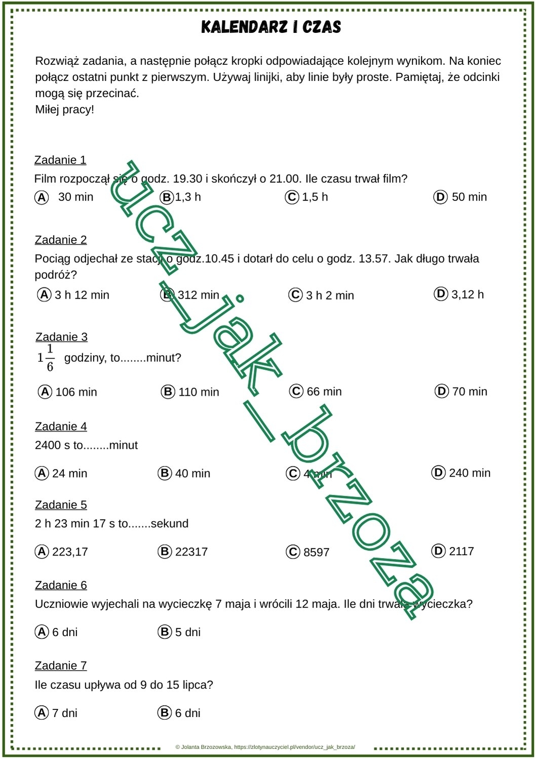 Karta pracy, połącz kropki, obliczenia zegarowe i kalendarzowe, klasa 6, kalendarz i czas
