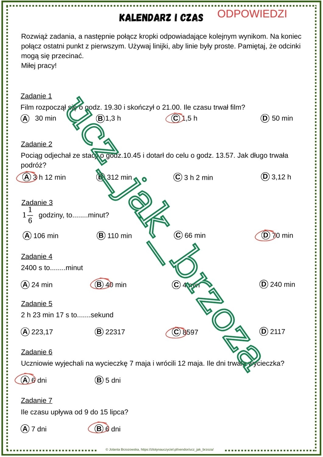 Karta praca zawiera 11 zadań utrwalających obliczenia zegarowe i kalendarzowe. Została również wzbogacona o zabawę typu „połącz kropki” – uczeń, rozwiązując kolejne przykłady i łącząc wyniki, odkryje ukryty obrazek. Materiał zawiera odpowiedzi.