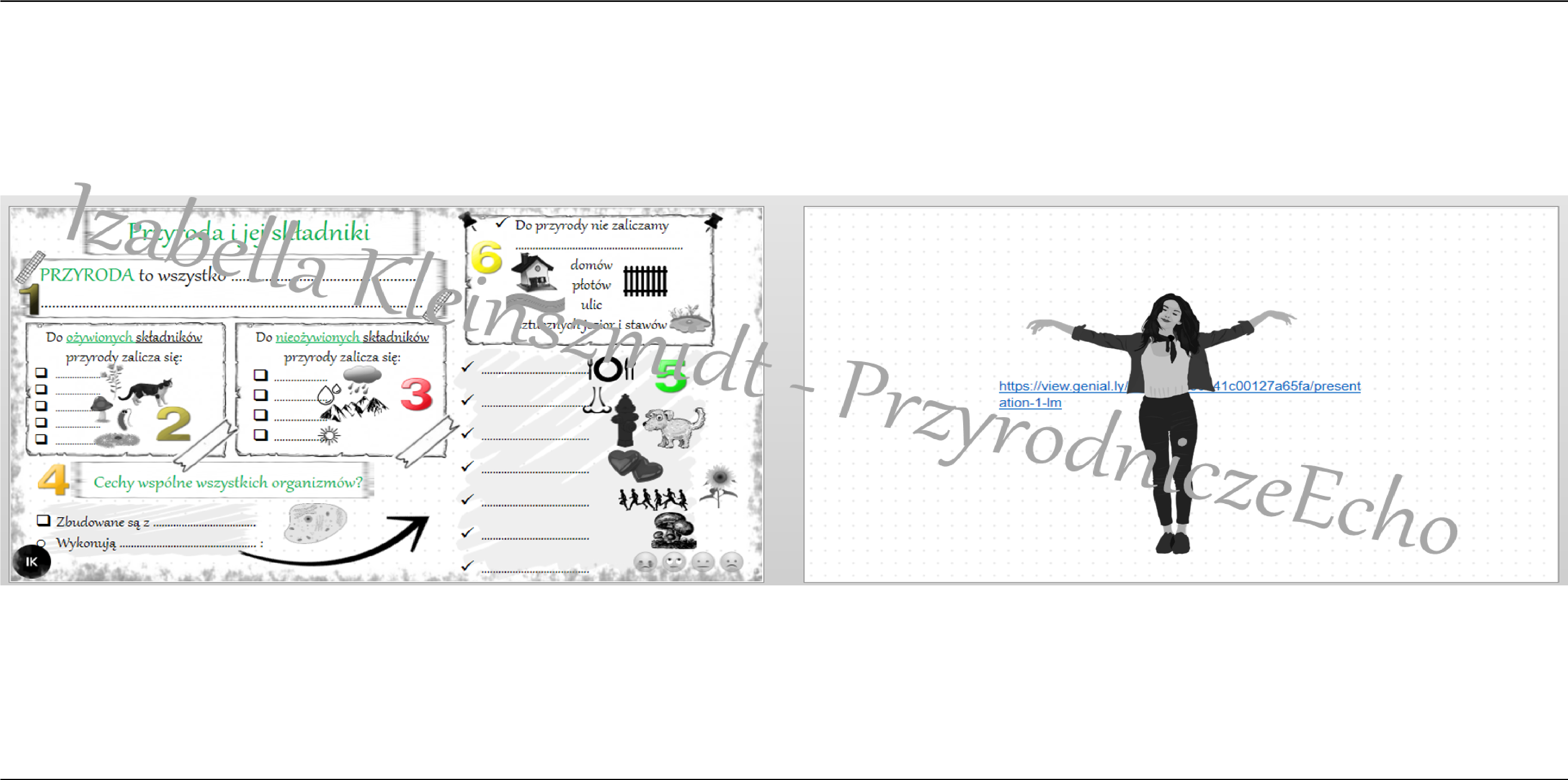Witajcie Nazywam się Izabella Kleinszmidt (PrzyrodniczeEcho). Jestem nauczycielem przyrody, biologii, geografii i chemii w szkole podstawowej w Pomysku Wielkim. Uwielbiam mój zawód i cieszę się, że robię w życiu to co kocham. Pasja dla nauczyciela jest bardzo ważna:). Prowadzę stronę PrzyrodniczeEcho na FB, nagrywam filmiki do lekcji, konstruuję prezentacje i lekcje multimedialne, escape roomy oraz sketchnotki i karty pracy w programie power point. Zapraszam na stronę internetową mojej szkoły, gdzie znajdują się (niektóre darmowe) opracowania lekcji do przyrody, biologii, geografii i chemii w SP. Adres strony internetowej: https://sppomyskwielki.edu.pl - zakładka - dla ucznia. Od niedawna zapraszam również na moją stronę internetową: https://ikleinszmidt.wixsite.com/przyrodniczeecho Zapraszam do korzystania z mojej pracy:) Bardzo proszę również czytać opisy, aby wiedzieć, jaki materiał znajduje się w danym pliku. Zachęcam do kontaktu w razie jakichś pytań lub błędów w pomocach - brakach lub literówkach-wszystko można naprawić? Jakich materiałów możecie Państwo oczekiwać? SKETCHNOTKA - notatka kompletna z określonego tematu KARTA PRACY - zazwyczaj sketchnotka z wykropkowanymi miejscami PREZENTACJA MULTIMEDIALNA - kompletne wiadomości do odpowiedniego tematu wraz z grafiką i tekstem - zarówno w power point jak i genially - tę koniecznie należy zapisać na swoim koncie! LEKCJA MULTIMEDIALNA - pomysł na przeprowadzenie lekcji - taki "tok lekcji" - skrócony scenariusz ZESTAWY - proszę się wczytać w opis, informuję co mieści się w konkretnym zestawie:) Pozdrawiam cieplutko:)