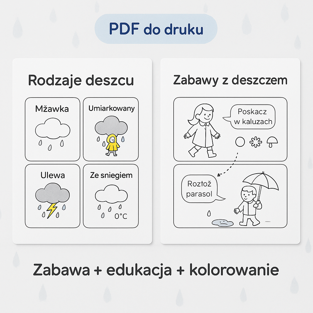 #deszcz #kartaPracy #edukacjaPrzedszkolna #rodzajeDeszczu #pogoda #ulewa #mżawka #zima #obiegWody #edukacjawczesnoszkolna #kartyDoDruku #naukaPrzezZabawę #materiałyDlaNauczyciela #przedszkole #edukacjadomowa #pdfdydaktyczny #zabawyZDziećmi #obserwatorPogody