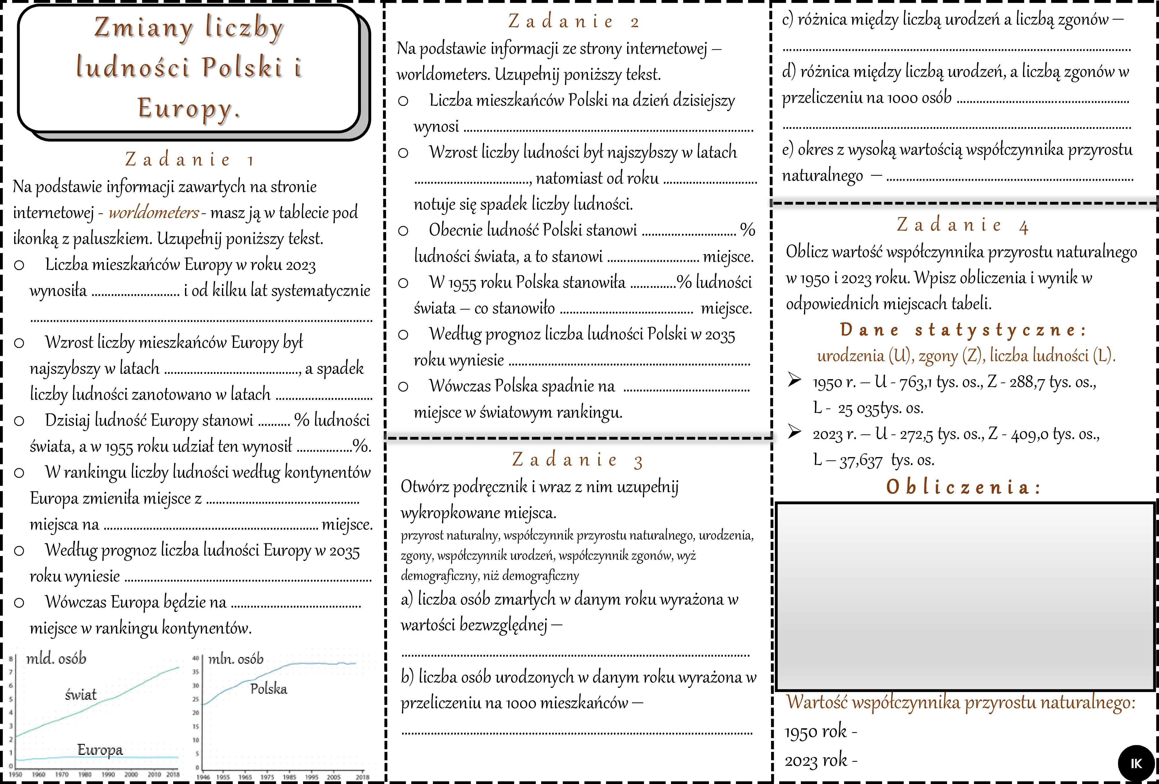 Karta pracy/stacje zadaniowe/ notatki/ materiał do lekcji do tematu „Zmiany liczby ludności Polski i Europy.” w pdf. W gratisie niekomercyjny scenariusz lekcji/pomysł na lekcję w programie genial.ly do edycji. Geografia 7. Dział „Ludność i urbanizacja”.