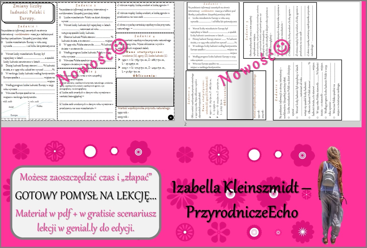 Witajcie Nazywam się Izabella Kleinszmidt (PrzyrodniczeEcho). Jestem nauczycielem przyrody, biologii, geografii i chemii w szkole podstawowej w Pomysku Wielkim. Uwielbiam mój zawód i cieszę się, że robię w życiu to co kocham. Pasja dla nauczyciela jest bardzo ważna:). Prowadzę stronę PrzyrodniczeEcho na FB, nagrywam filmiki do lekcji, konstruuję prezentacje i lekcje multimedialne, escape roomy oraz sketchnotki i karty pracy w programie power point. Zapraszam na stronę internetową mojej szkoły, gdzie znajdują się (niektóre darmowe) opracowania lekcji do przyrody, biologii, geografii i chemii w SP. Adres strony internetowej: https://sppomyskwielki.edu.pl - zakładka - dla ucznia. Od niedawna zapraszam również na moją stronę internetową: https://ikleinszmidt.wixsite.com/przyrodniczeecho Zapraszam do korzystania z mojej pracy:) Bardzo proszę również czytać opisy, aby wiedzieć, jaki materiał znajduje się w danym pliku. Zachęcam do kontaktu w razie jakichś pytań lub błędów w pomocach - brakach lub literówkach-wszystko można naprawić? Jakich materiałów możecie Państwo oczekiwać? SKETCHNOTKA - notatka kompletna z określonego tematu KARTA PRACY - zazwyczaj sketchnotka z wykropkowanymi miejscami PREZENTACJA MULTIMEDIALNA - kompletne wiadomości do odpowiedniego tematu wraz z grafiką i tekstem - zarówno w power point jak i genially - tę koniecznie należy zapisać na swoim koncie! LEKCJA MULTIMEDIALNA - pomysł na przeprowadzenie lekcji - taki "tok lekcji" - skrócony scenariusz ZESTAWY - proszę się wczytać w opis, informuję co mieści się w konkretnym zestawie:) Pozdrawiam cieplutko:)