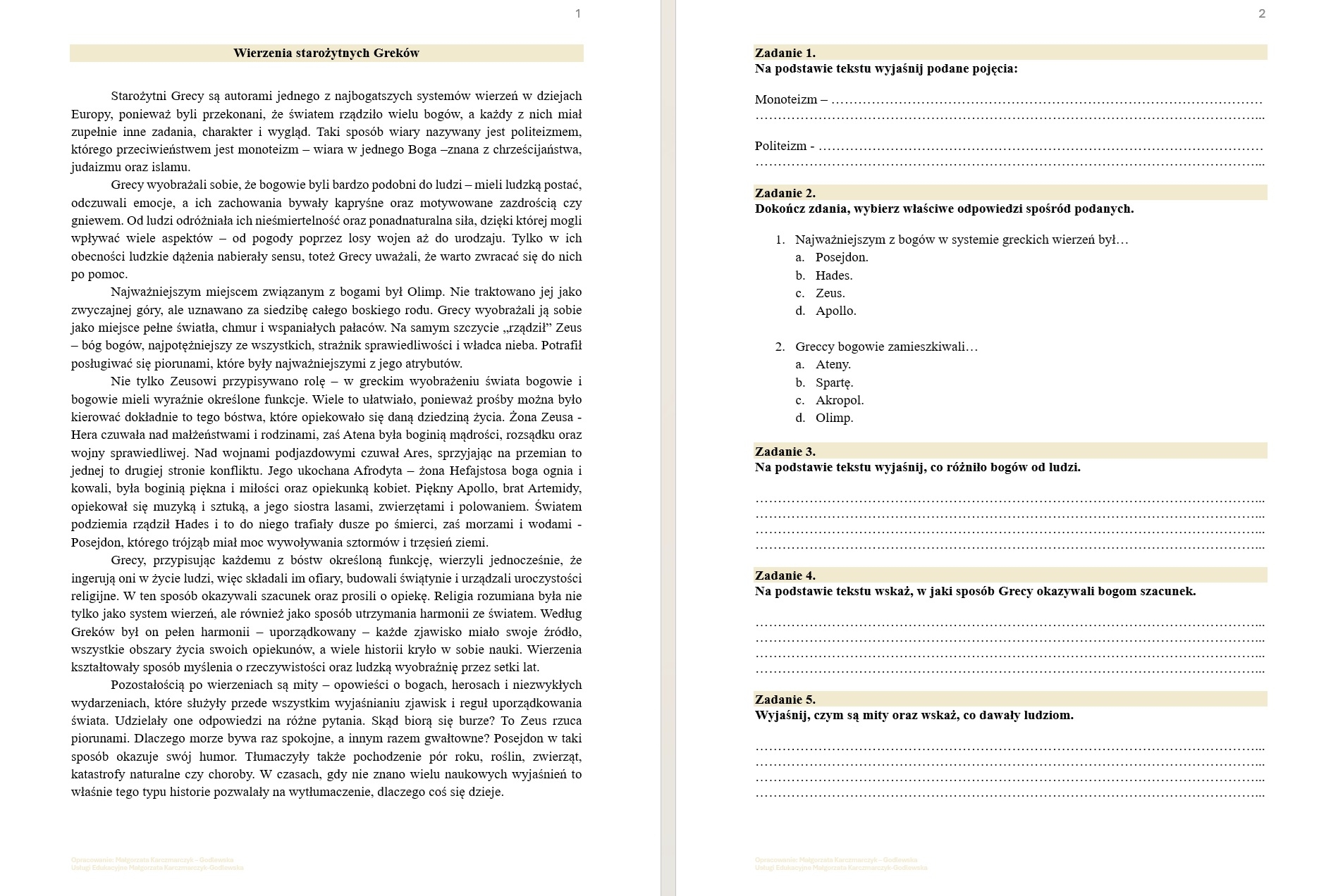 Materiał idealnie nadaje się do lekcji wprowadzających/podsumowujących do działu o mitologii, lekcji powtórzeniowych lub sprawdzających,pracy samodzielnej ucznia, pracy w parach lub grupach, kartkówek i sprawdzianów bieżących, pracy własnej, uzupełnienia zajęć w ramach edukacji polonistycznej lub humanistycznej.