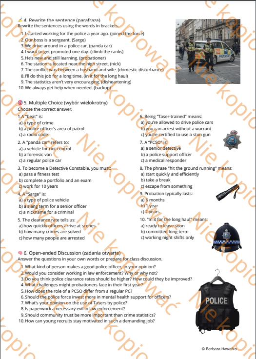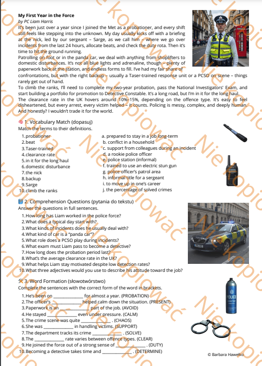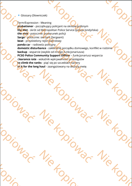 Autentyczny tekst narracyjny – napisany z perspektywy początkującego policjanta w Wielkiej Brytanii. To nie podręcznikowy suchar, tylko żywy język pełen policyjnego żargonu, ciekawostek i realiów służby.