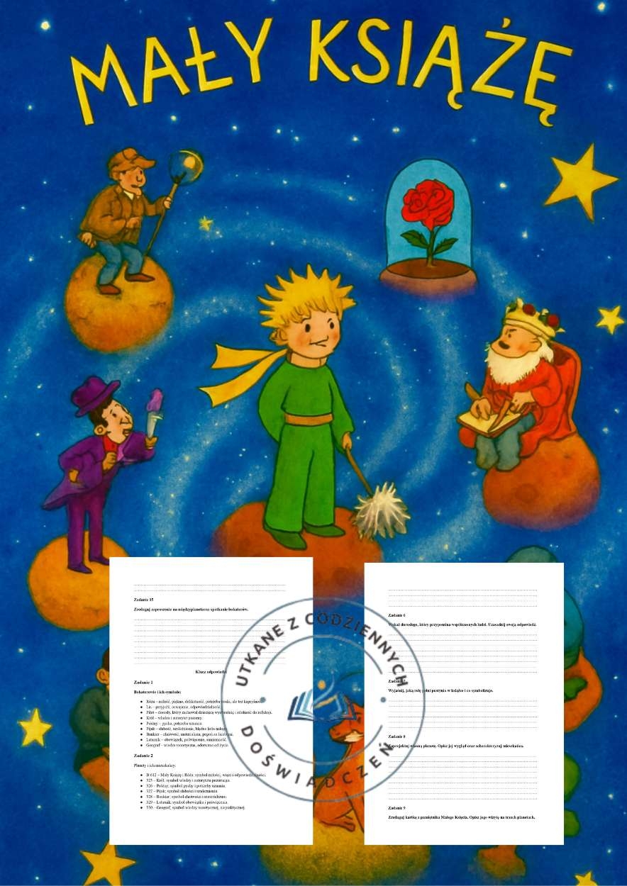 Po pierwsze, zadania prowadzą uczniów krok po kroku od prostego rozpoznawania bohaterów i planet aż po głęboką refleksję nad wartościami „niewidocznymi dla oczu”. To sprawia, że materiał jest spójny i logicznie uporządkowany, a jednocześnie angażuje różne poziomy myślenia – od pamięciowego po krytyczne i twórcze.