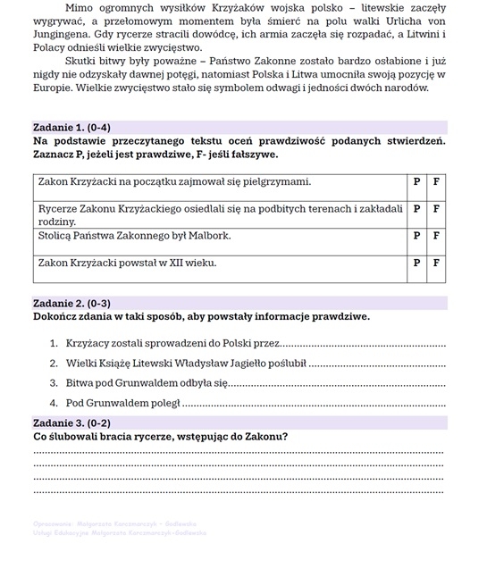 Karta pracy składająca się z ilustracji, tekstu oraz pytań. Doskonała jako uzupełnienie lekcji na temat bitwy pod Grunwaldem/Jadwigi i Jagiełły.