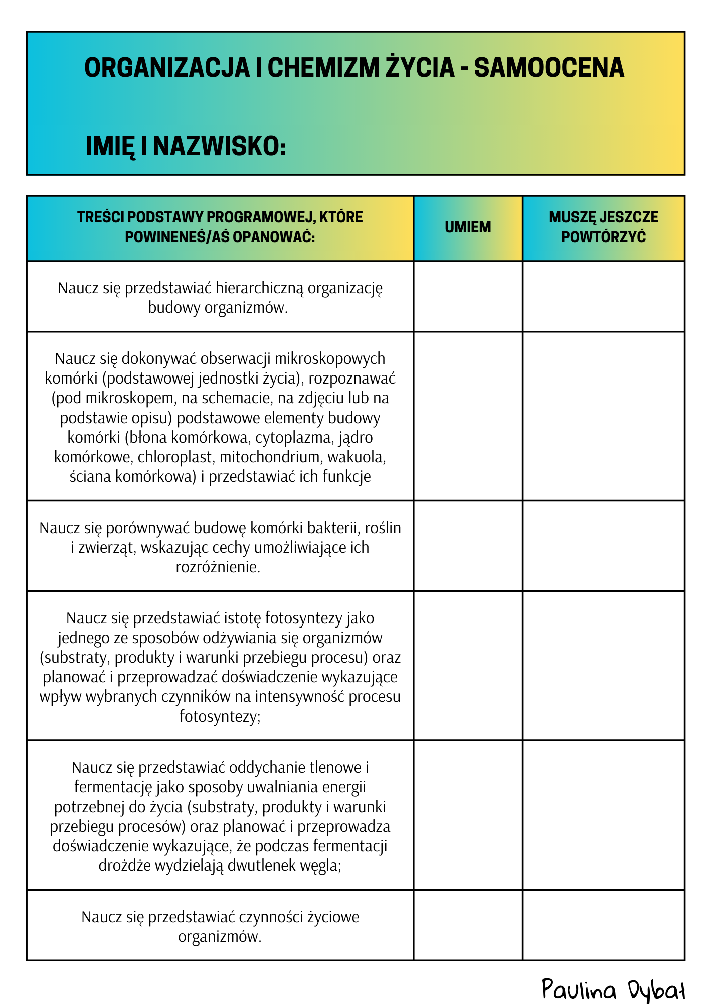 Materiał zawiera karty samooceny dla ucznia, wykonane na podstawie obowiązującej od 1 września 2024 roku odchudzonej podstawy programowej z biologii dla klasy 5. Karty podzielone są na działy: organizacja i chemizm życia; różnorodność życia - wirusy, bakterie, grzyby; różnorodność i jedność roślin. Uczeń ma możliwość zaznaczenia w tabeli, czy umie dany punkt podstawy programowej, czy wymaga on jeszcze powtórzenia. Materiał może być pomocny w trakcie nauki do egzaminów z edukacji domowej lub jako karta kontrolna przed sprawdzianem.