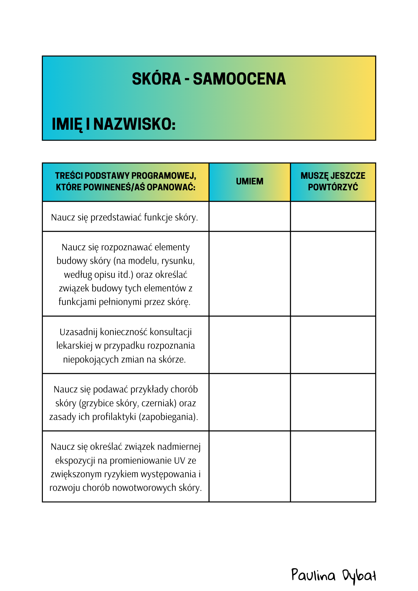 Materiał zawiera karty samooceny dla ucznia, wykonane na podstawie obowiązującej od 1 września 2024 roku odchudzonej podstawy programowej z biologii dla klasy 7. Kary podzielone są na działy: skóra, układ ruchu, układ pokarmowy i odżywianie się, układ krążenia, układ odpornościowy, układ oddechowy, układ moczowy i wydalanie, układ nerwowy, narządy zmysłów, układ rozrodczy, homeostaza. Uczeń ma możliwość zaznaczenia w tabeli, czy umie dany punkt podstawy programowej, czy wymaga on jeszcze powtórzenia. Materiał może być pomocny w trakcie nauki do egzaminów z edukacji domowej lub jako karta kontrolna przed sprawdzianem.