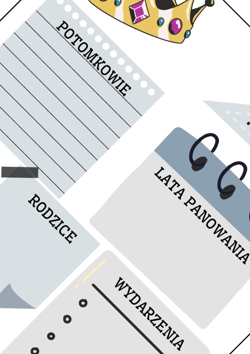Dwie wersje karty pracy - karta króla, karta władcy. Należy umieścić informacje o władcy/królu: lata panowania, ważne wydarzenia, potomkowie, rodzice, wiadomości warte zapamiętania i miejsce na ciekawostki o postaci.