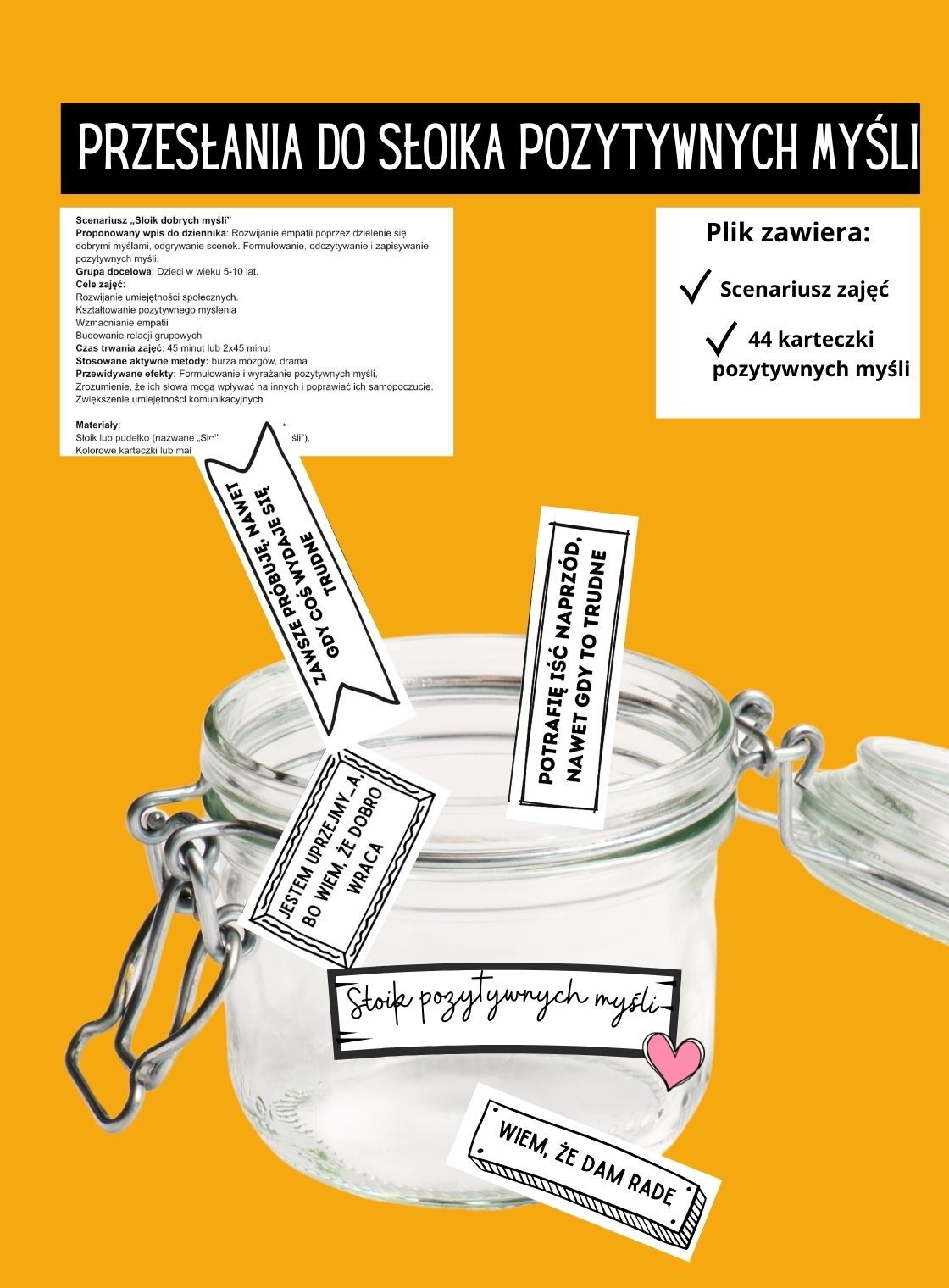 Scenariusz zajęć wraz z 44 przesłaniami (karteczkami motywacyjnymi). Plik do samodzielnego wydruku. Scenariusz do edycji. Na zajęcia rewalidacyjne, kreatywne, emocjonalno - społeczne. Dla dzieci w wieku 6-10 lat.