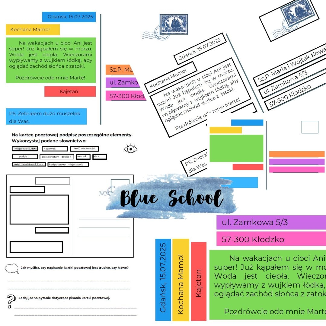 W zestawie znajdują się szablony budowy kartki pocztowej – w wersji czarno-białej oraz kolorowej, w formacie A4 i 2xA4 do sklejenia – kartki pocztowe z nazwami poszczególnych elementów, z wpisanym tekstem pozdrowień oraz szablony z okienkami i elementy do wycięcia, które uczniowie w nich umieszczają.