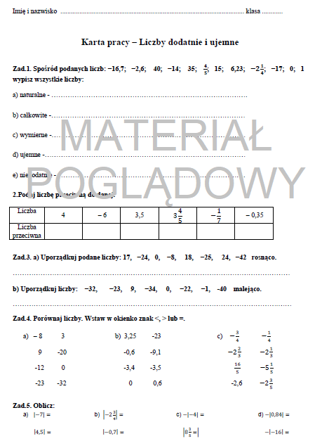 Kartka pracy - liczby wymierne (dodatnie i ujemne)