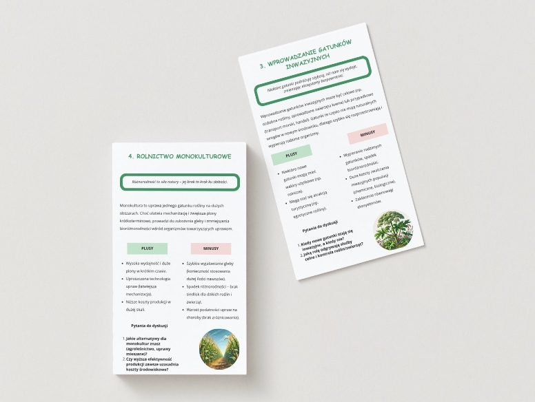 Poznaj innowacyjny materiał, który łączy wiedzę ekologiczną z atrakcyjną formą prezentacji. Każda z 12 kart porusza inny temat związany z ochroną przyrody i bioróżnorodności – od wycinki lasów, przez gatunki inwazyjne i monokultury, aż po zrównoważoną turystykę i nadmierne połowy.