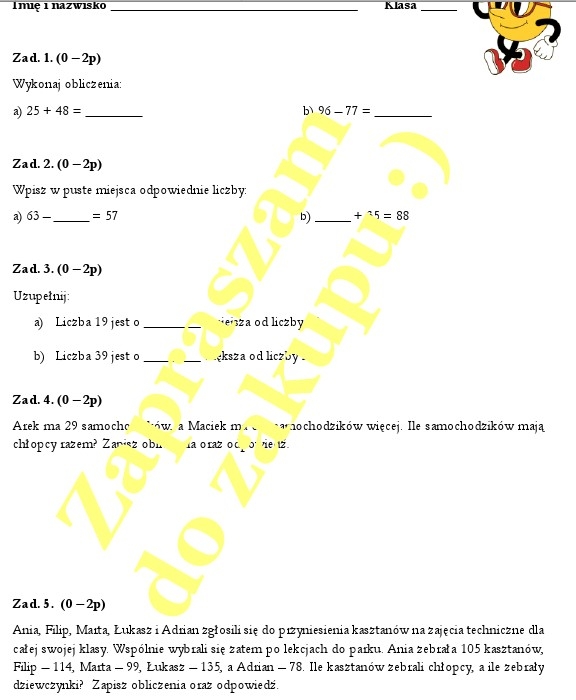 Kartkówka dotyczy takich tematów jak dodawanie i odejmowanie w pamięci oraz o ile mniej, o ile więcej. Do materiału dołączono przykładowe rozwiązania.