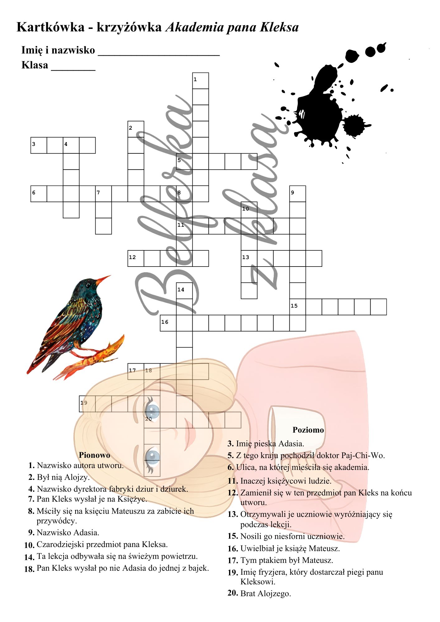 W krzyżówce znajduje się dwadzieścia haseł, które sprawdzają wiedzę uczniów na temat przeczytanej lektury.