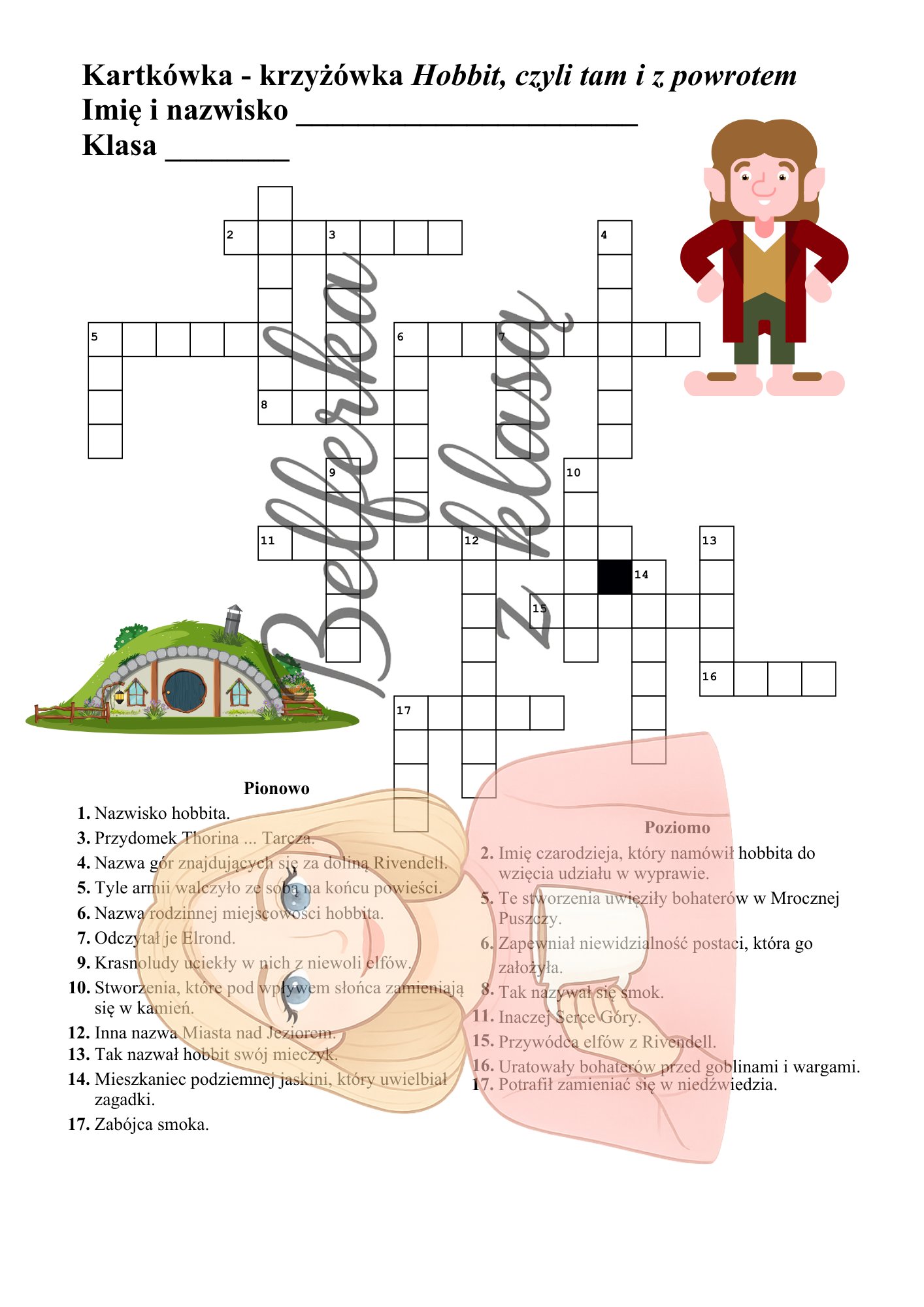 Kartkówka w formie krzyżówki sprawdzająca wiedzę uczniów na temat lektury obowiązkowej "Hobbit, czyli tam i z powrotem".