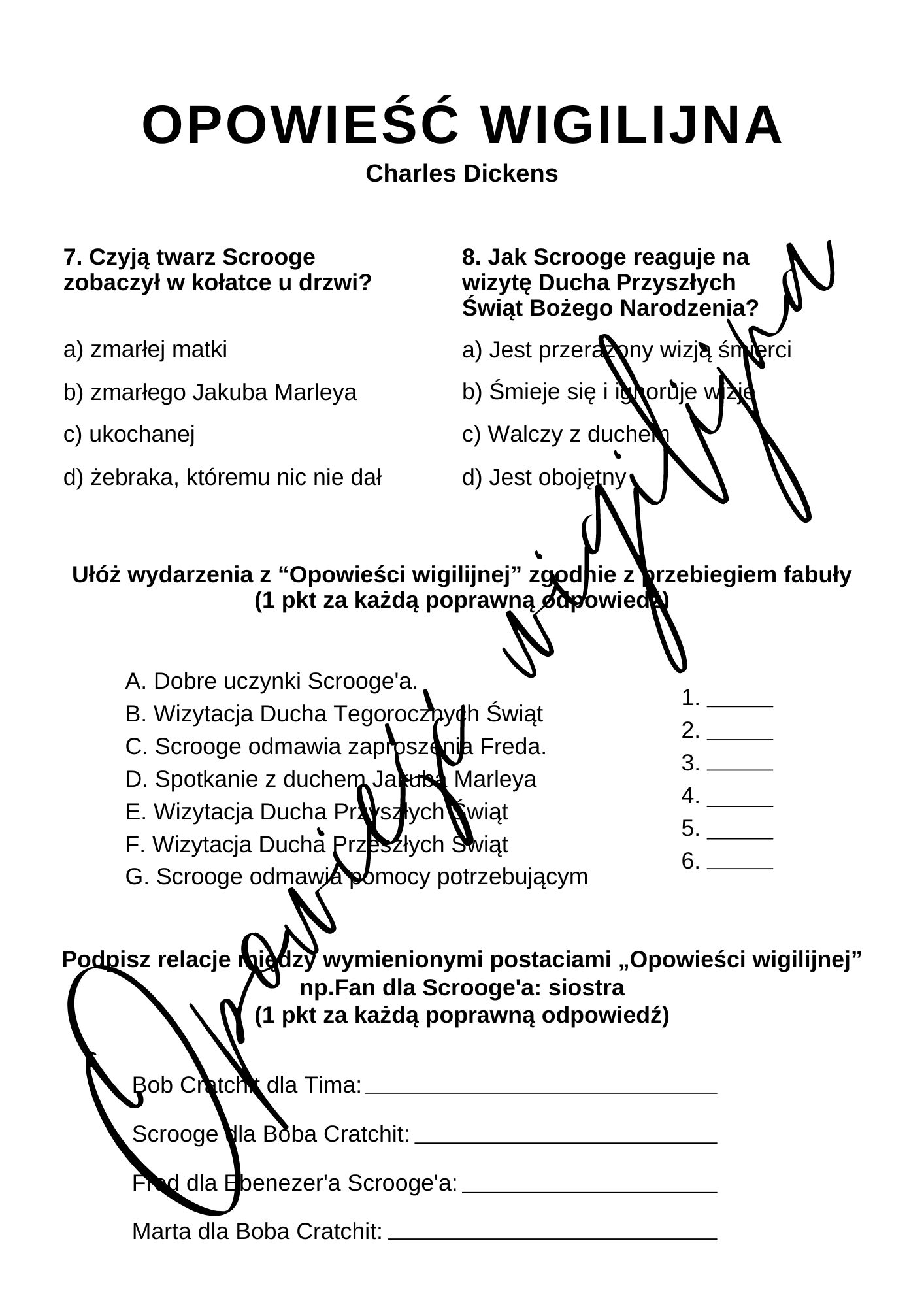 Cel kartkówki: Celem kartkówki jest nie tylko sprawdzenie wiedzy uczniów, ale także zachęcenie ich do przemyśleń nad przesłaniami zawartymi w Opowieści wigilijnej. Kartkówka wspiera rozwijanie umiejętności krytycznego myślenia oraz analizy literackiej.