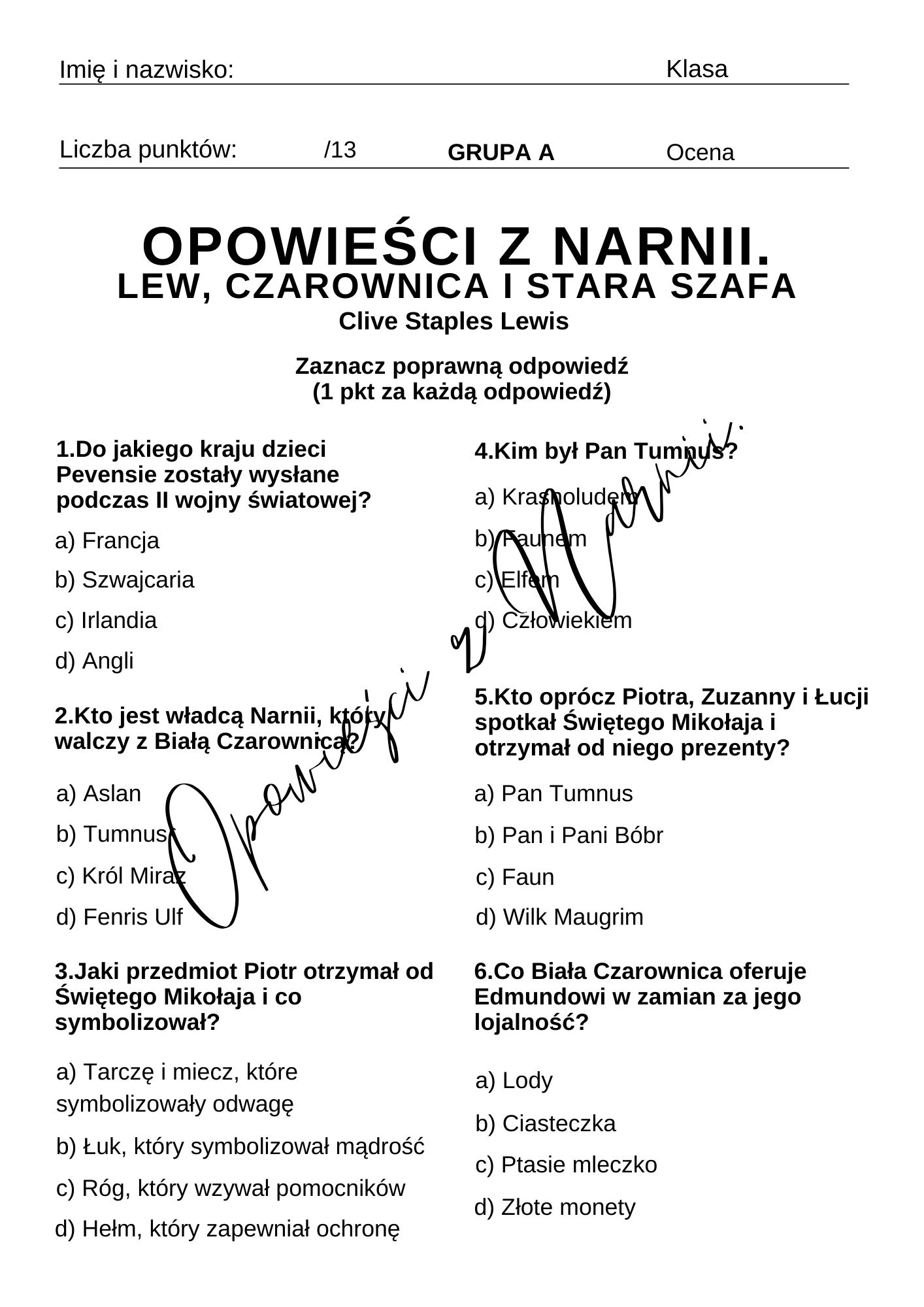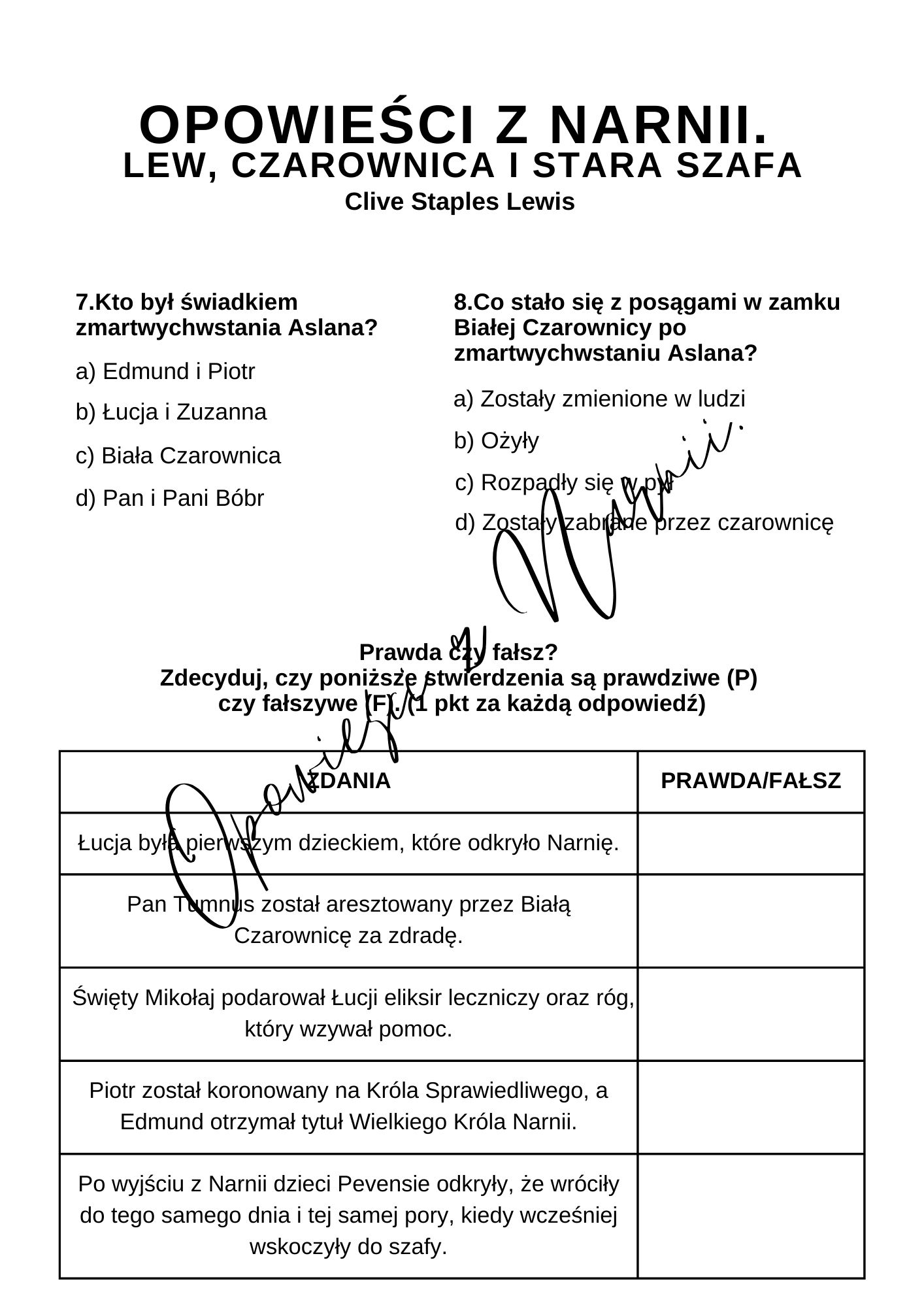 Kartkówka składa się z 11 pytań sprawdzających znajomość lektury "Opowieści z Narnii. Lew, czarownica i stara szafa" autorstwa C.S. Lewisa.Jest to idealne narzędzie do oceny wiedzy uczniów oraz ich zrozumienia kluczowych tematów i postaci w książce.