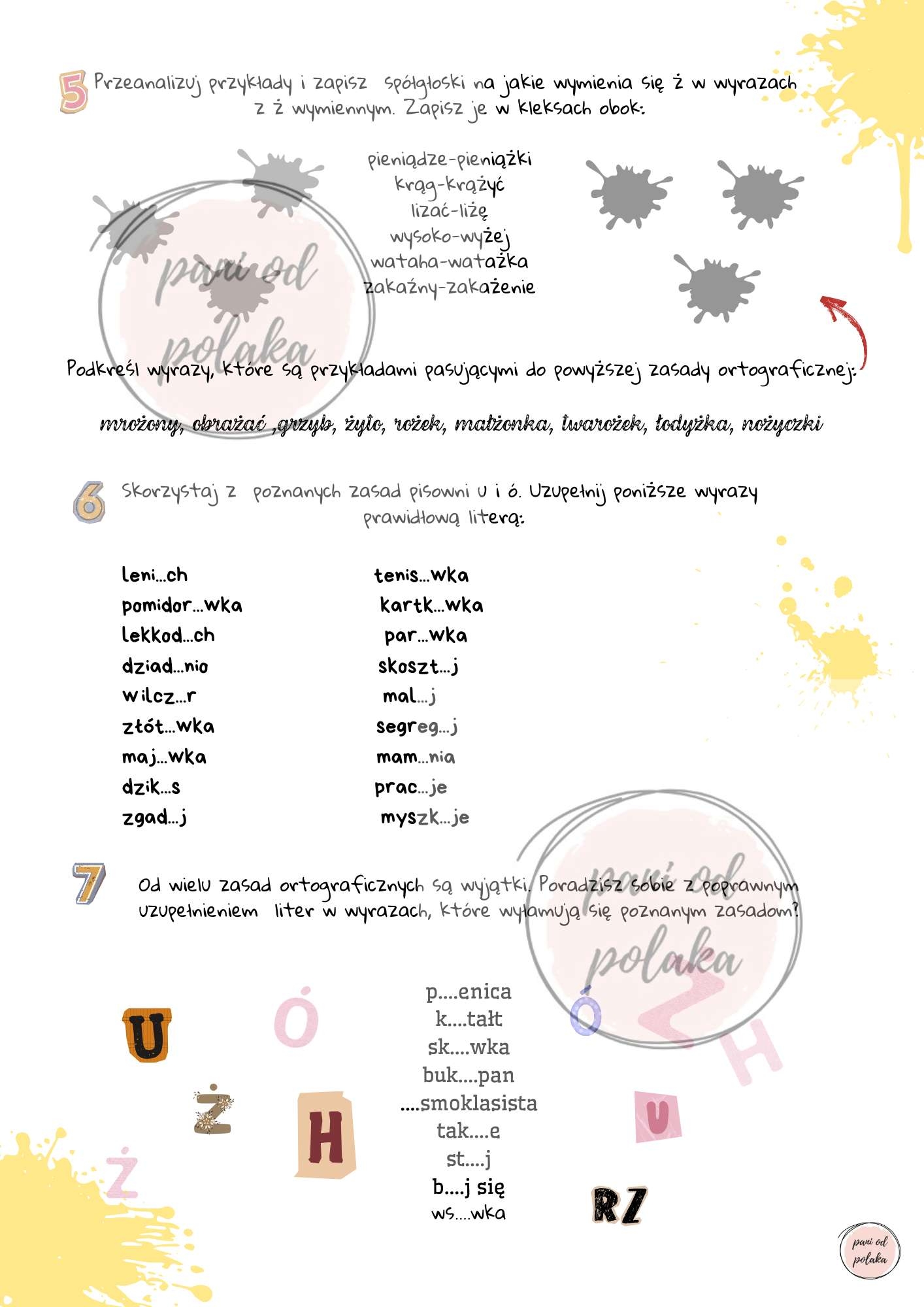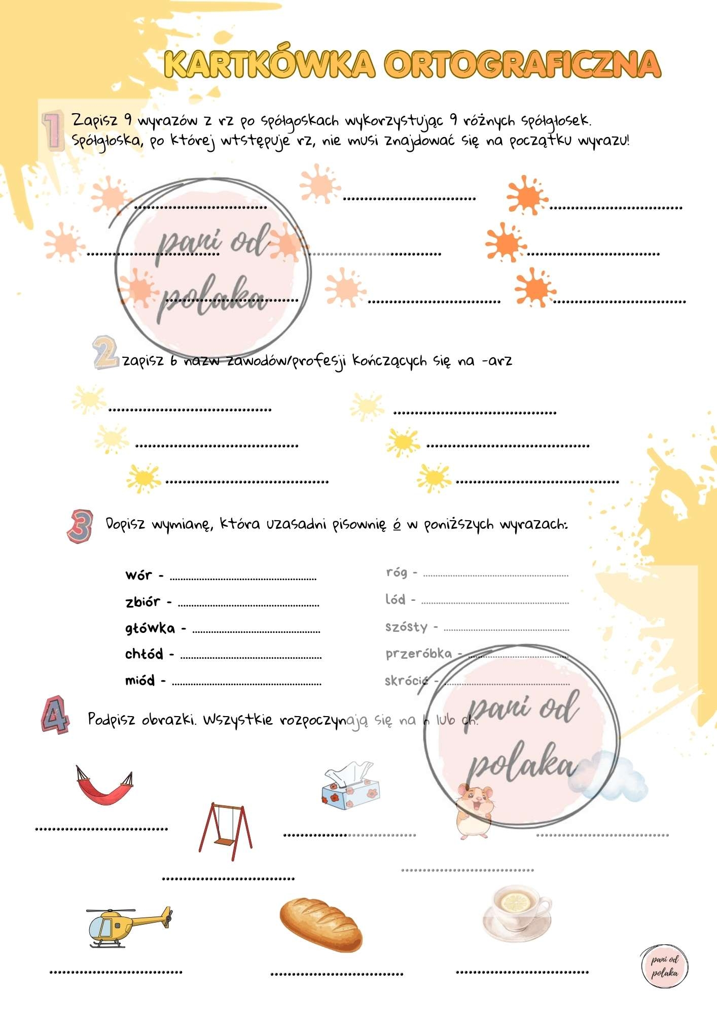 Kartkówka ortograficzna obejmuje zagadnienie dotyczące najpopularniejszych zasad ortograficznych dotyczących pisowni wyrazów z ó, u, rz, ż, h i ch. Konstrukcja kartkówki sprawia, że podczas pisania dzieci nie tylko popsują się swoja wiedzą, ale także powtarzają zasady pisowni i uczą się ich. Karkówka wymaga umiejętności zastosowania w praktyce poznanych zasad i pokazuje jak je stosować, aby pisać poprawnie. W katrkówce ukryte są też wyjątki,które pilnują, aby każdy był skupiony na swojej pracy:) Przyjemna i różnorodna forma pomoże zmobilizować nawet tych, którzy nie lubią klasycznych dyktand.