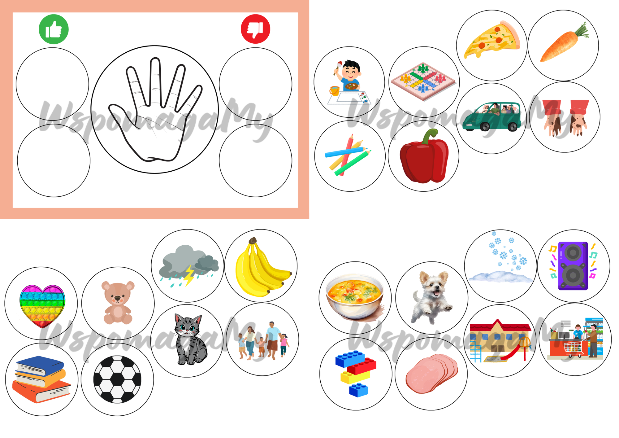 Układasz koła z rzeczami obrazkiem do spodu. Następnie dziecko losuje koło i przykleja w miejscu łapki w górę lub w dół. Grę można zalaminować i używać wielokrotnie na zajęciach indywidualnych lub w grupie. W prosty sposób dowiesz się, co dziecko lubi, a czego nie lubi. Możesz wykorzystać również pojedynczo kartę i poprosić dziecko o namalowanie dowolnych rzeczy, które lubi bądź nie.